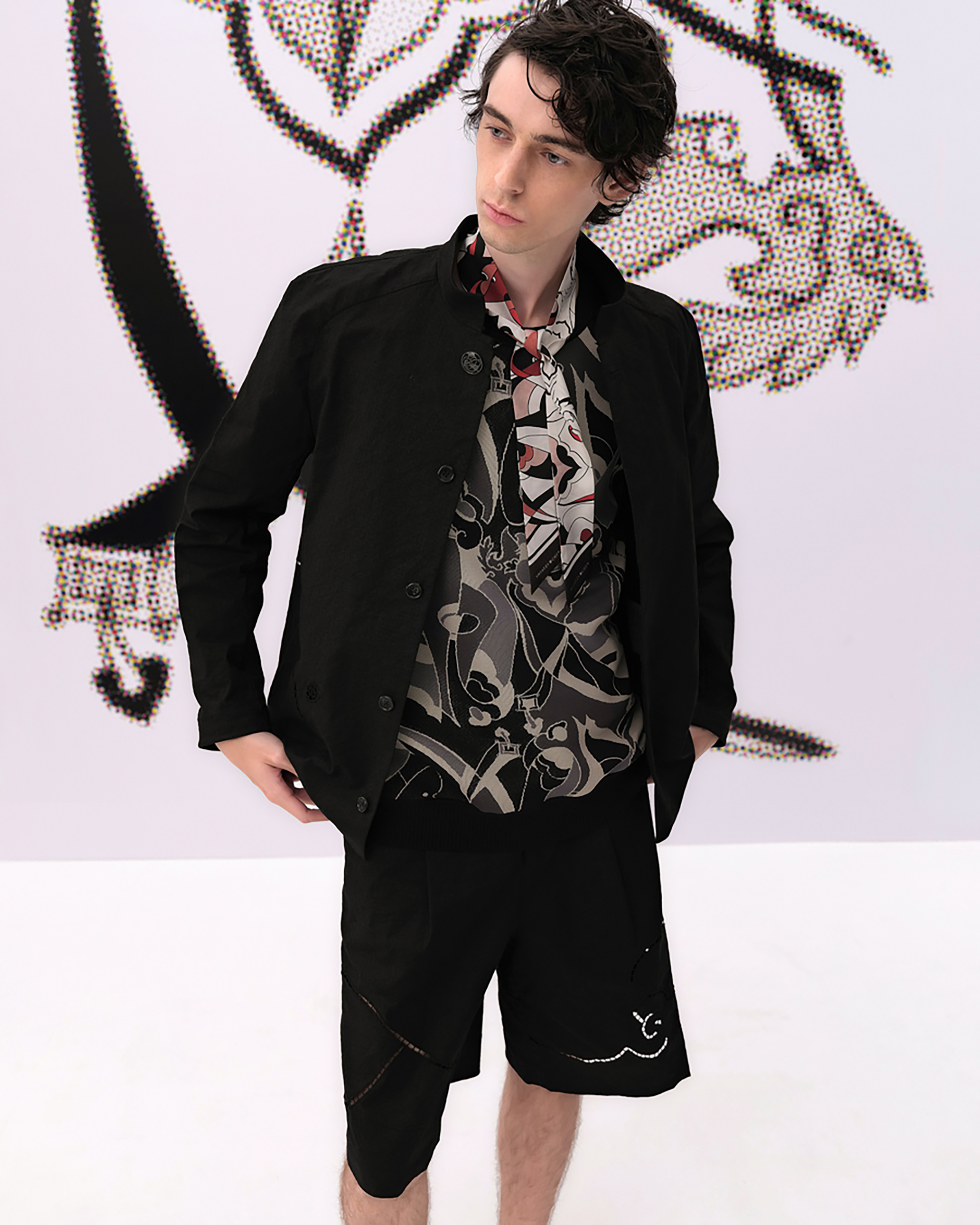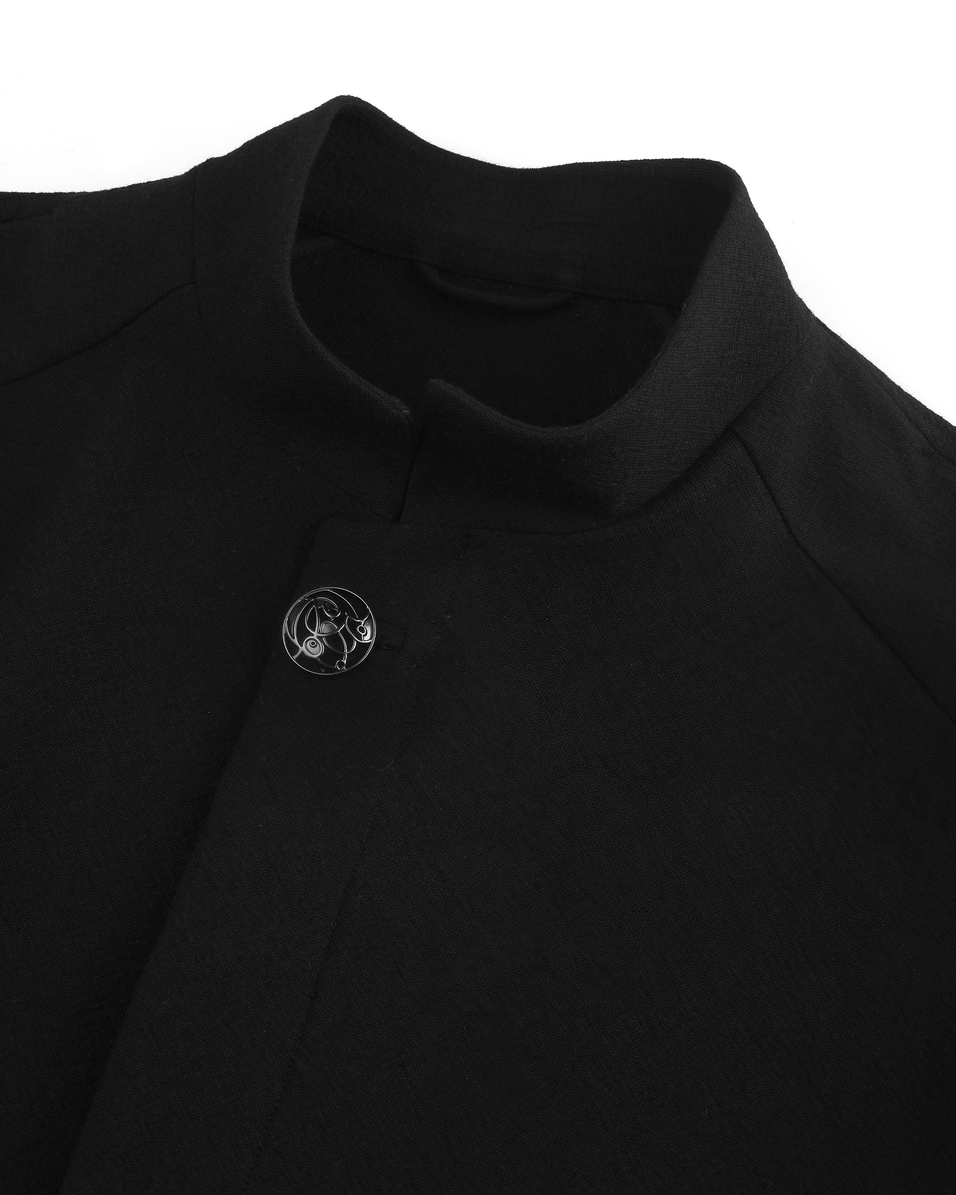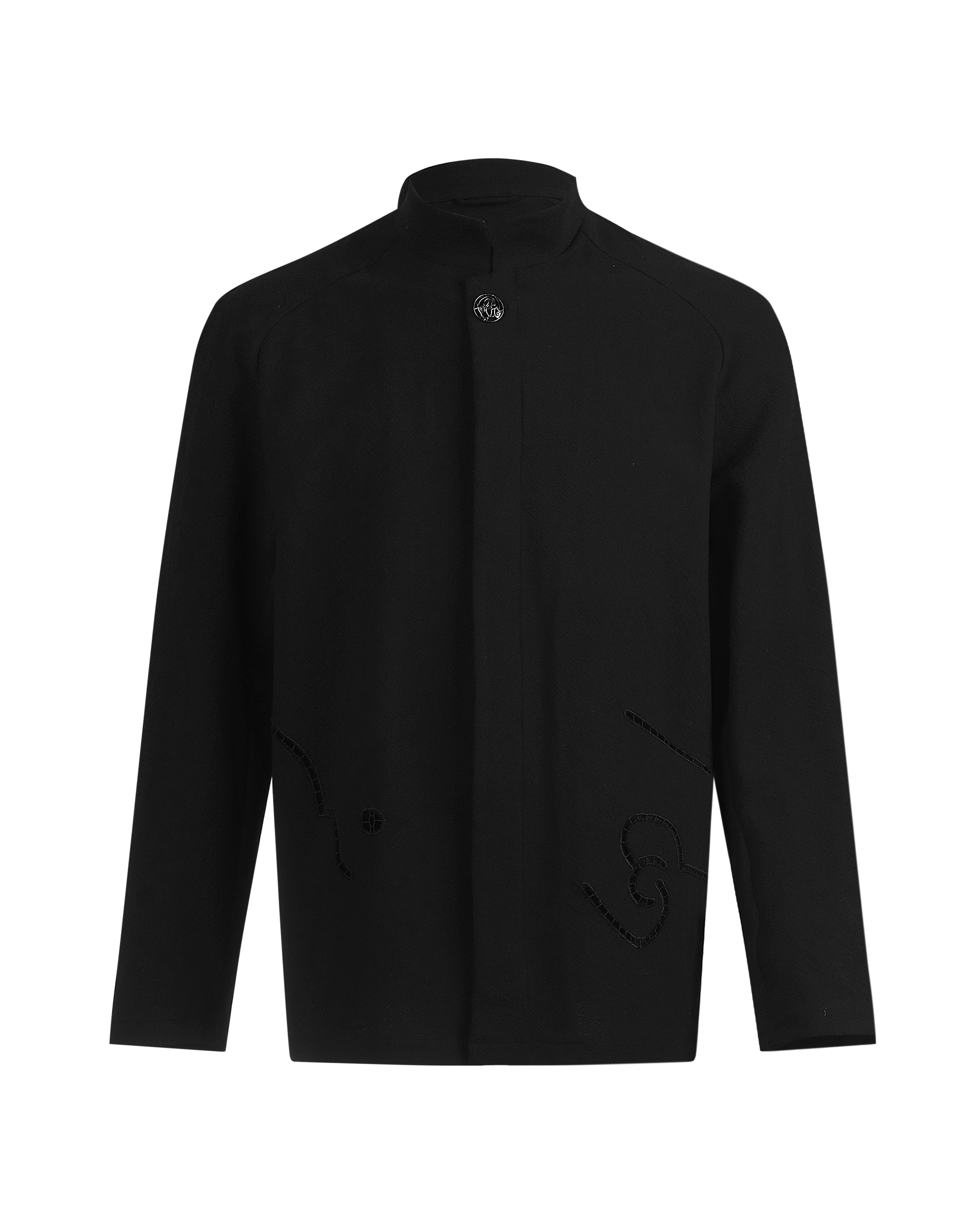 This jacket is tailored from extremely soft wool-cotton blend.  Embellished with the fretworked totem which is inspired from the Chinese traditional artifact-Ruyi. This piece is shaped in regular silhouette with low profile ornament that could lend a fresh touch to your gentleman look.