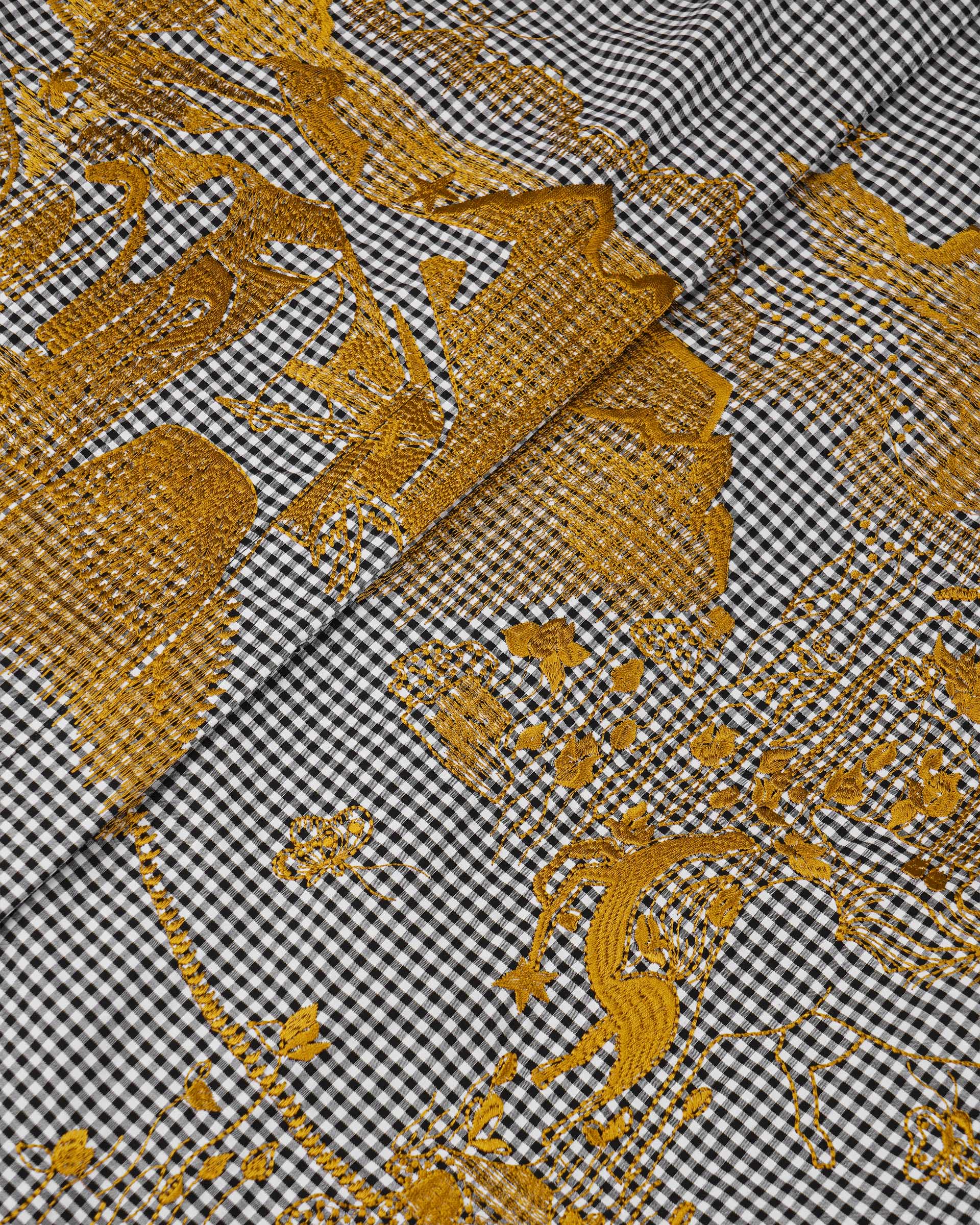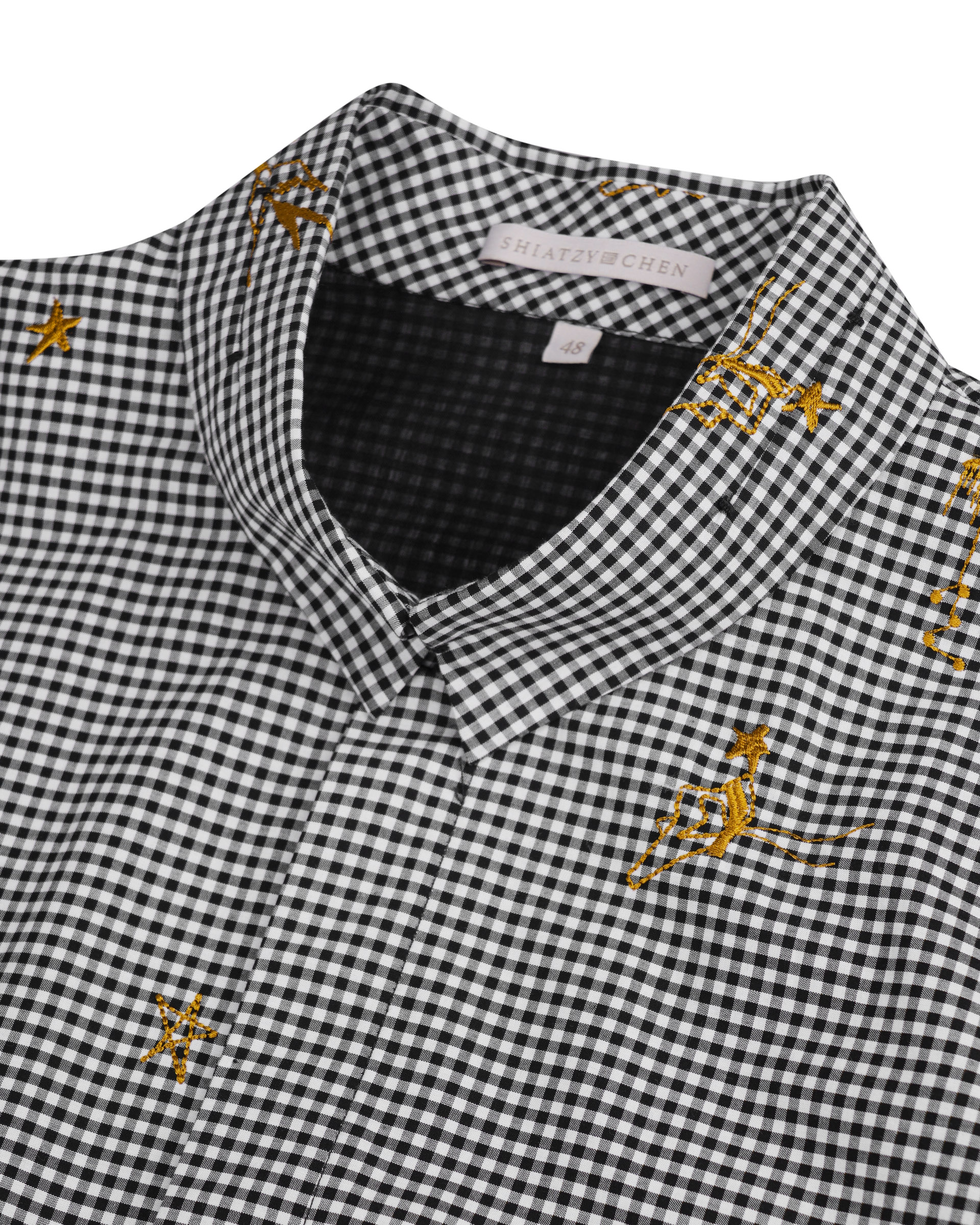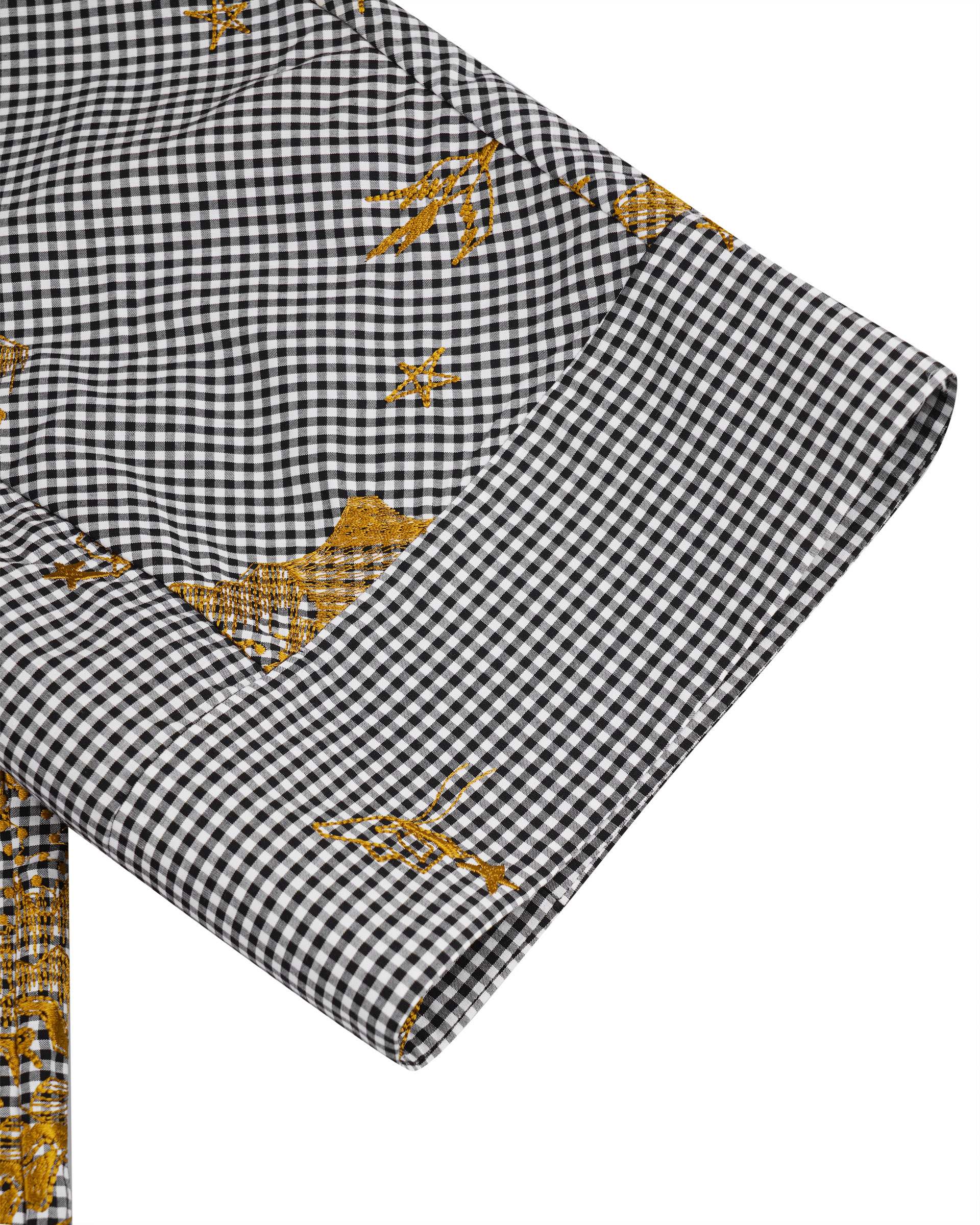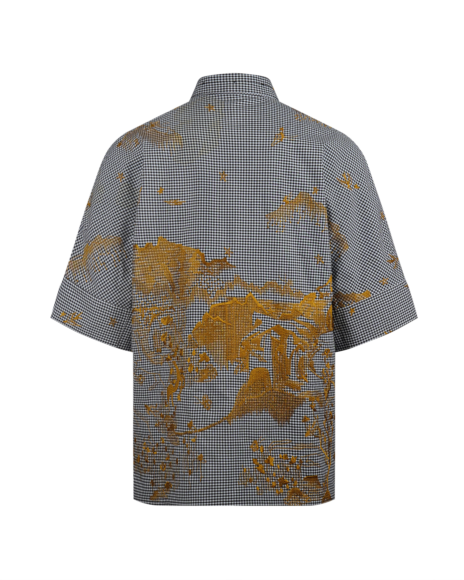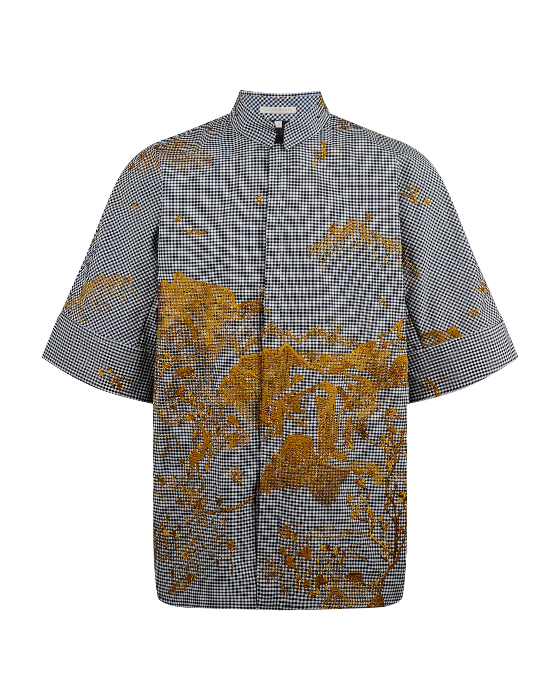 This shirt is tailored from exclusive embroidered cotton fabric that presents the scenery of Mulan's battle journey. The oversize silhouette is extremely chic, you also could take it as a summer cardigan that delivers a unique touch tou your summer look.