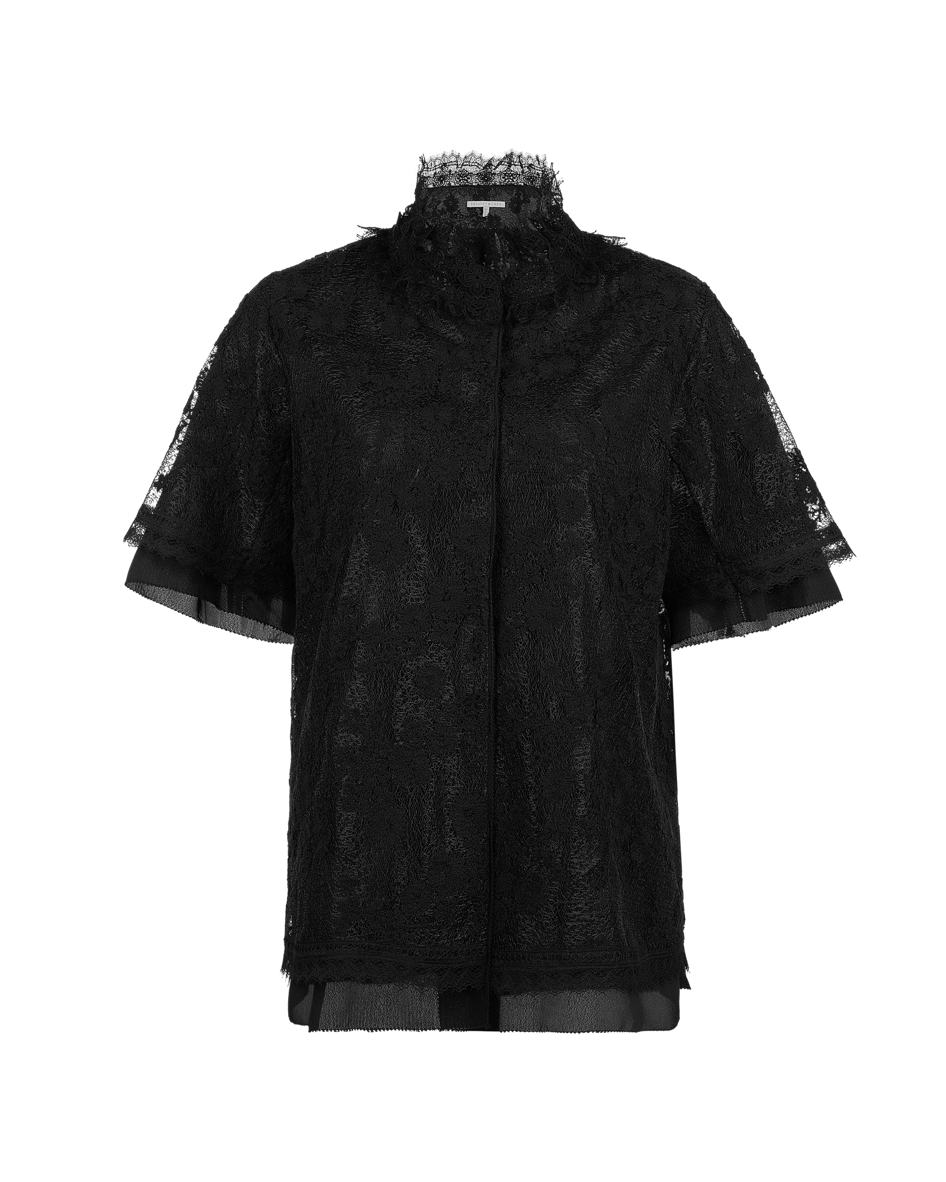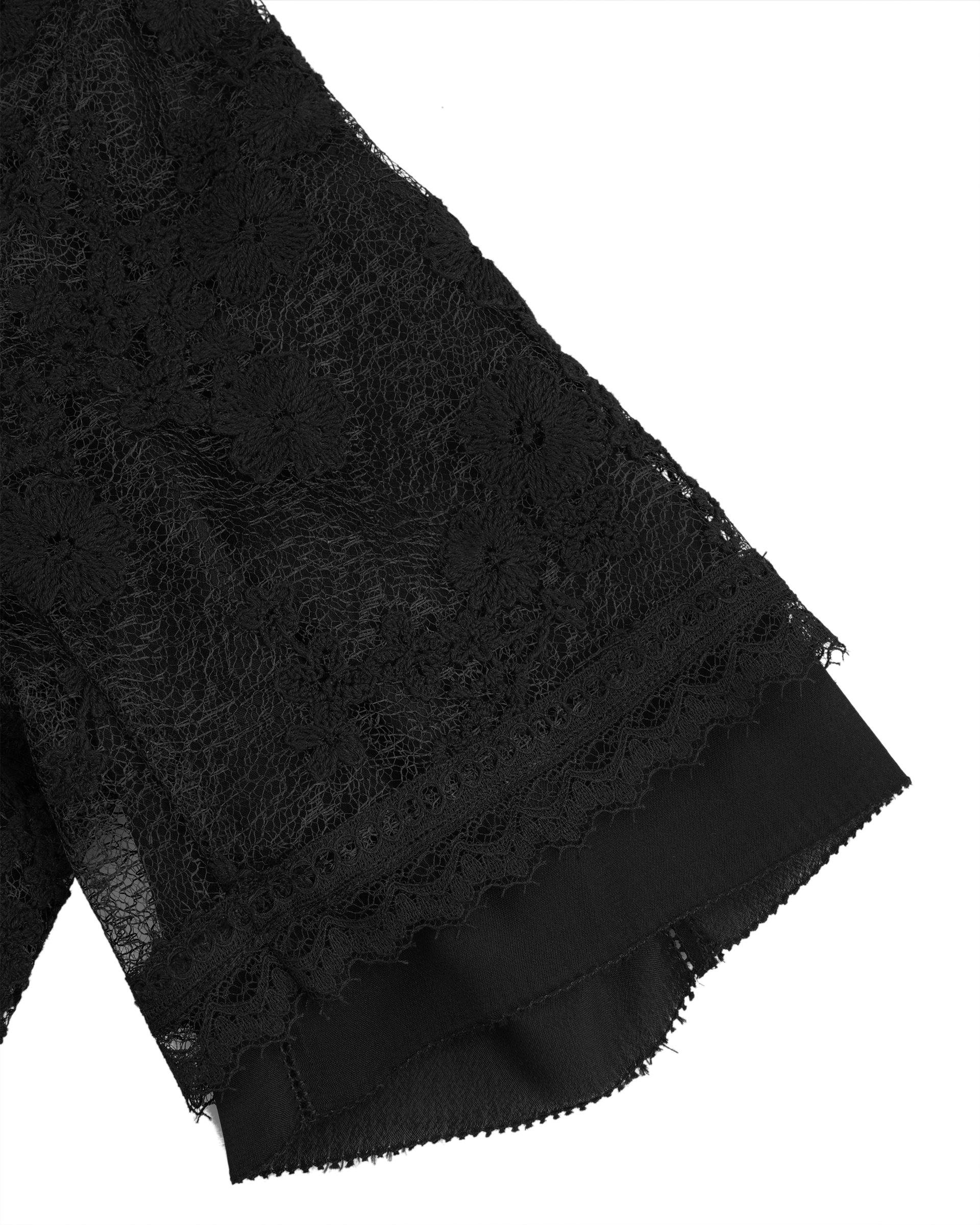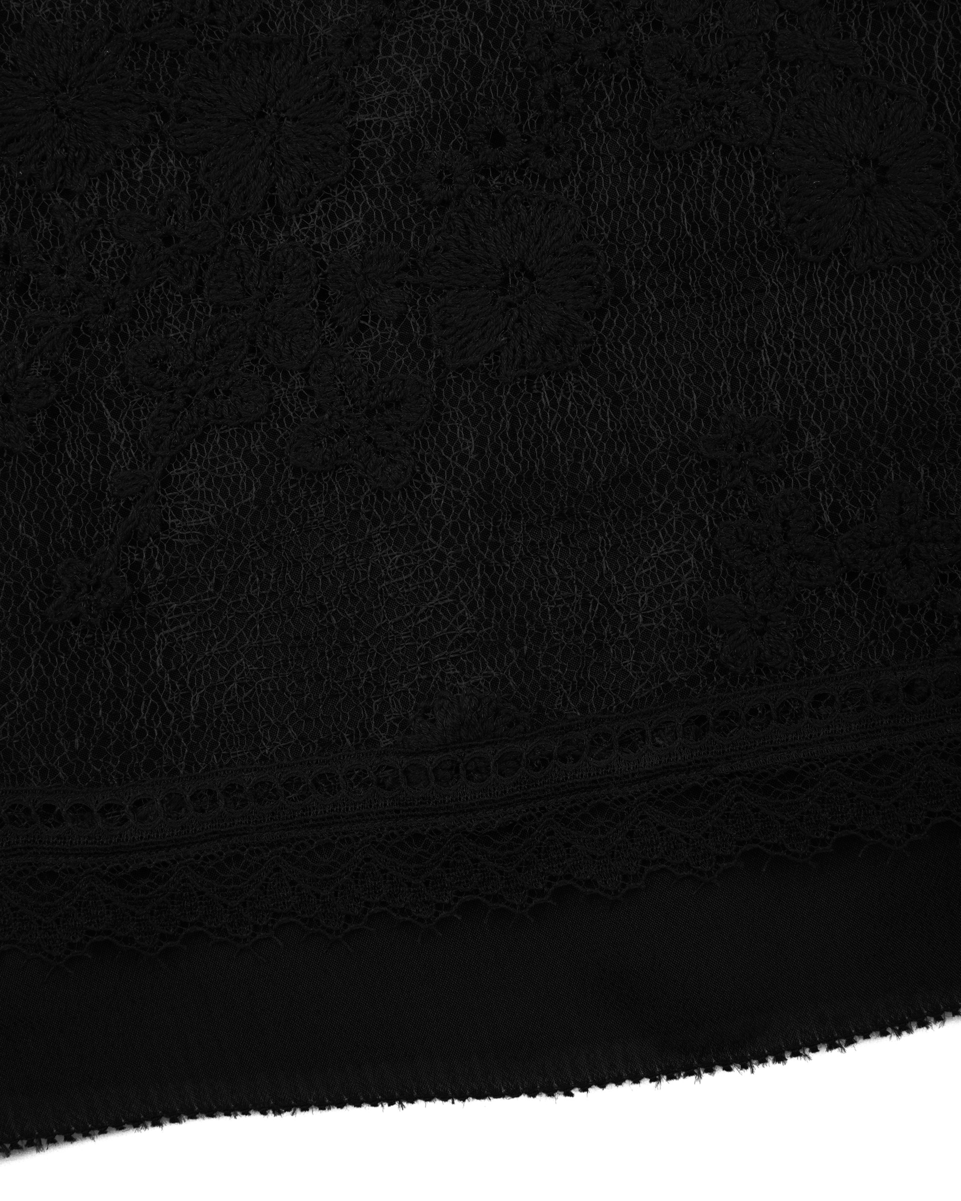 This jacket is made from delicate lace with classic pattern. The collar is full of touching layers and details that offer this piece a luxurious touch. This piece also could be a top to complete the light summer look.