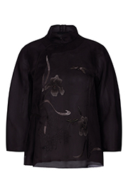 This blouse is composed by tulle and silk chiffon. The upper part presented a see-through effect,and embellished by the lace webbings to shape the geometric details. It could be paired with any kings of pants or skirts to build up the sophiscated ensembles.