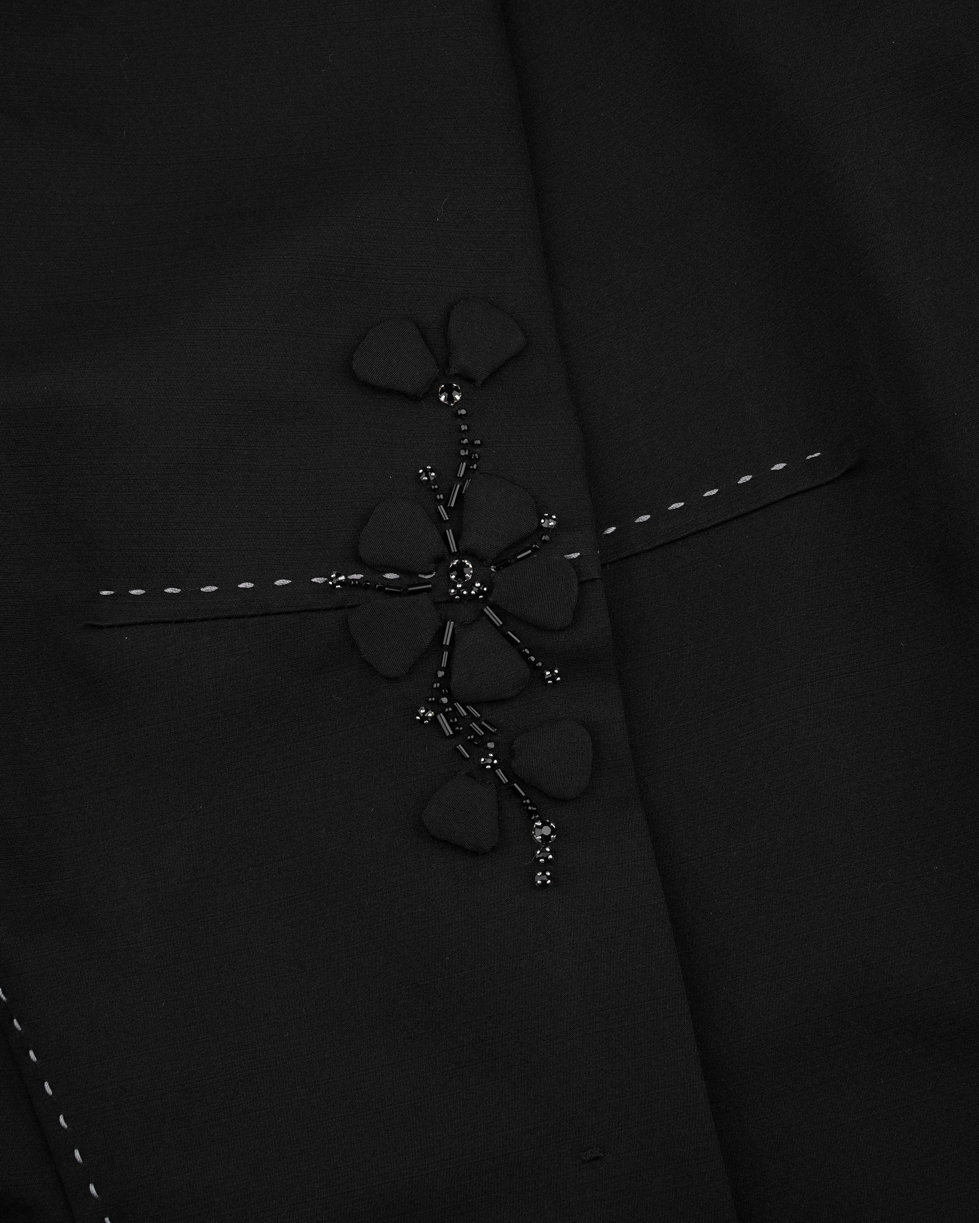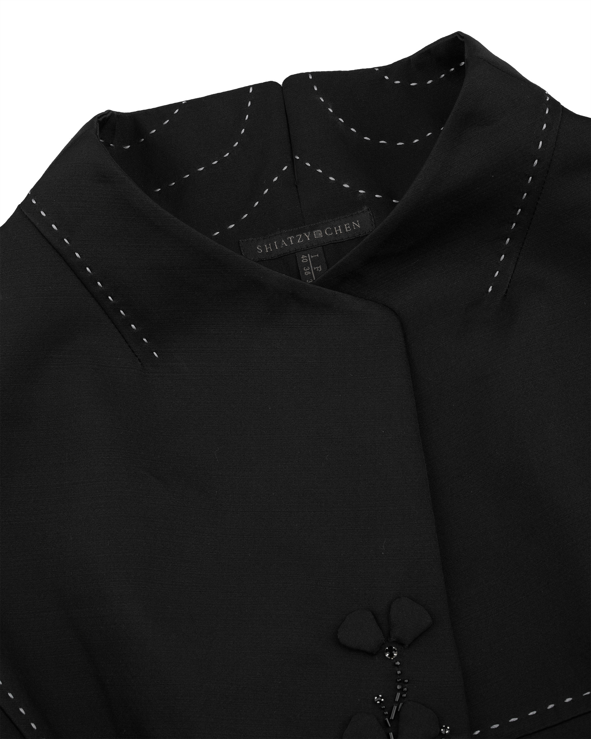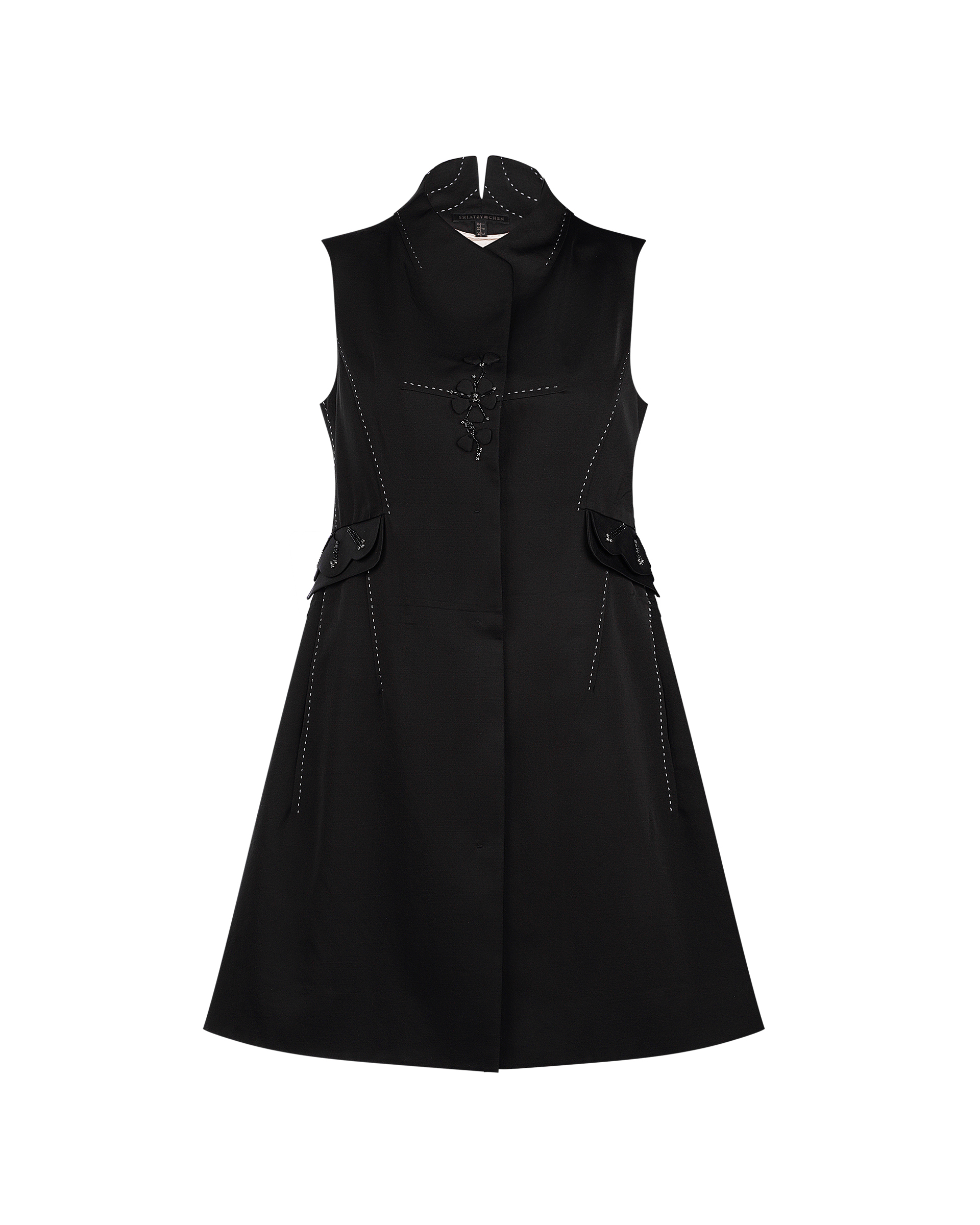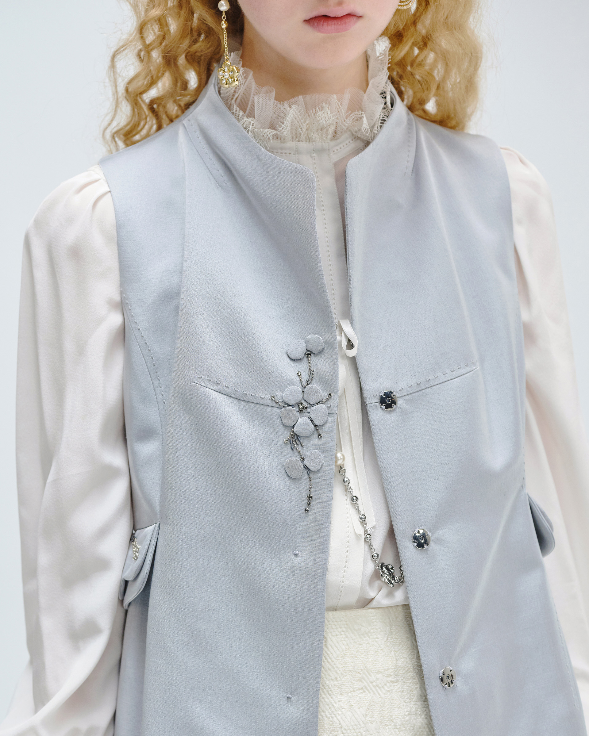 This vest is shaped in minimal silhouette within delicate details. The beading and appliqued plum blossom patterns are detailed on the pocket covers and front placket. The hand stitched curves are decorated on the opposite face of collar, it is the turely hidden luxury. This piece is tailored from shined wool-silk blend that could highlight your autumn looks with low profile glitter.