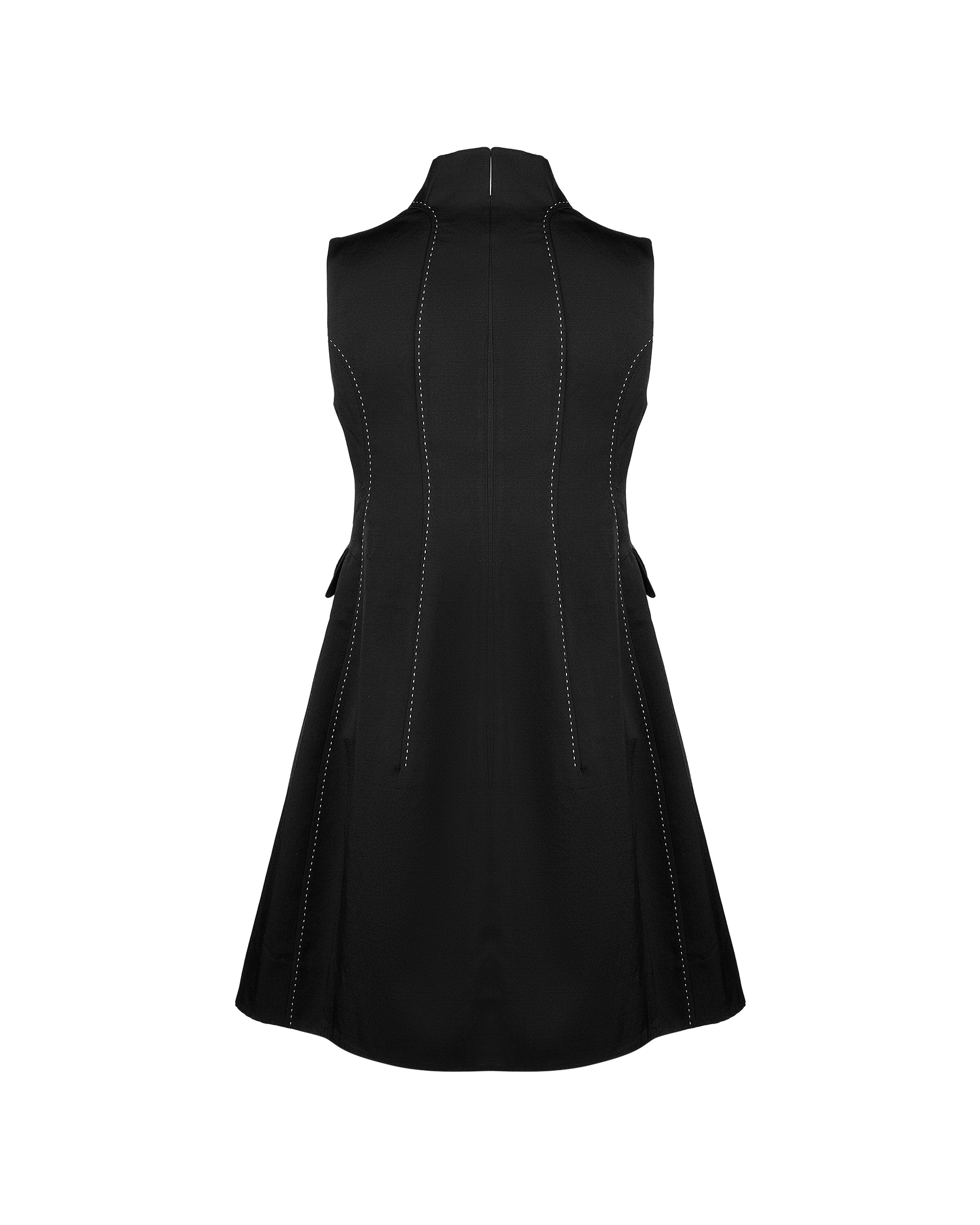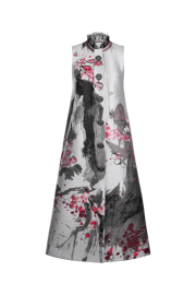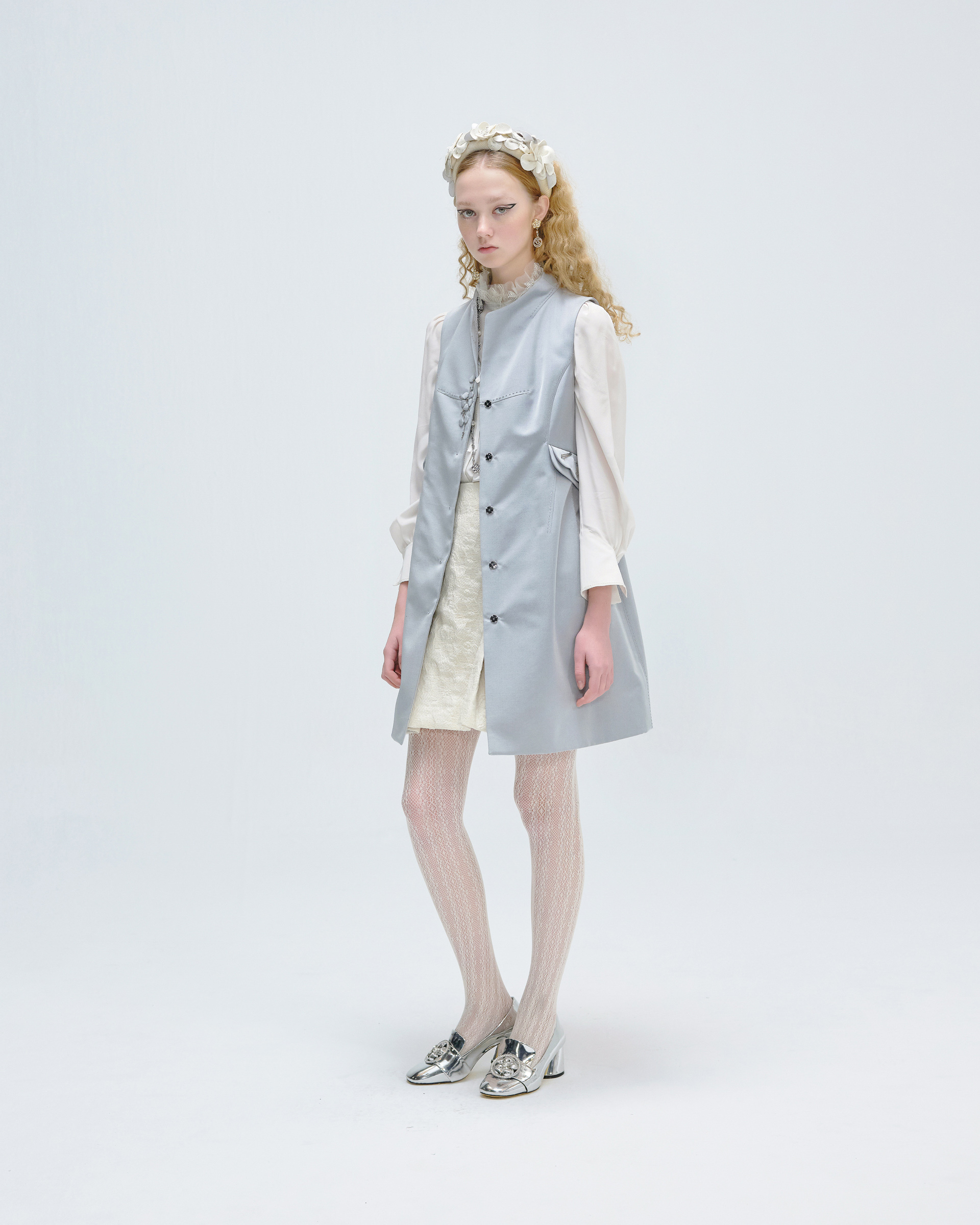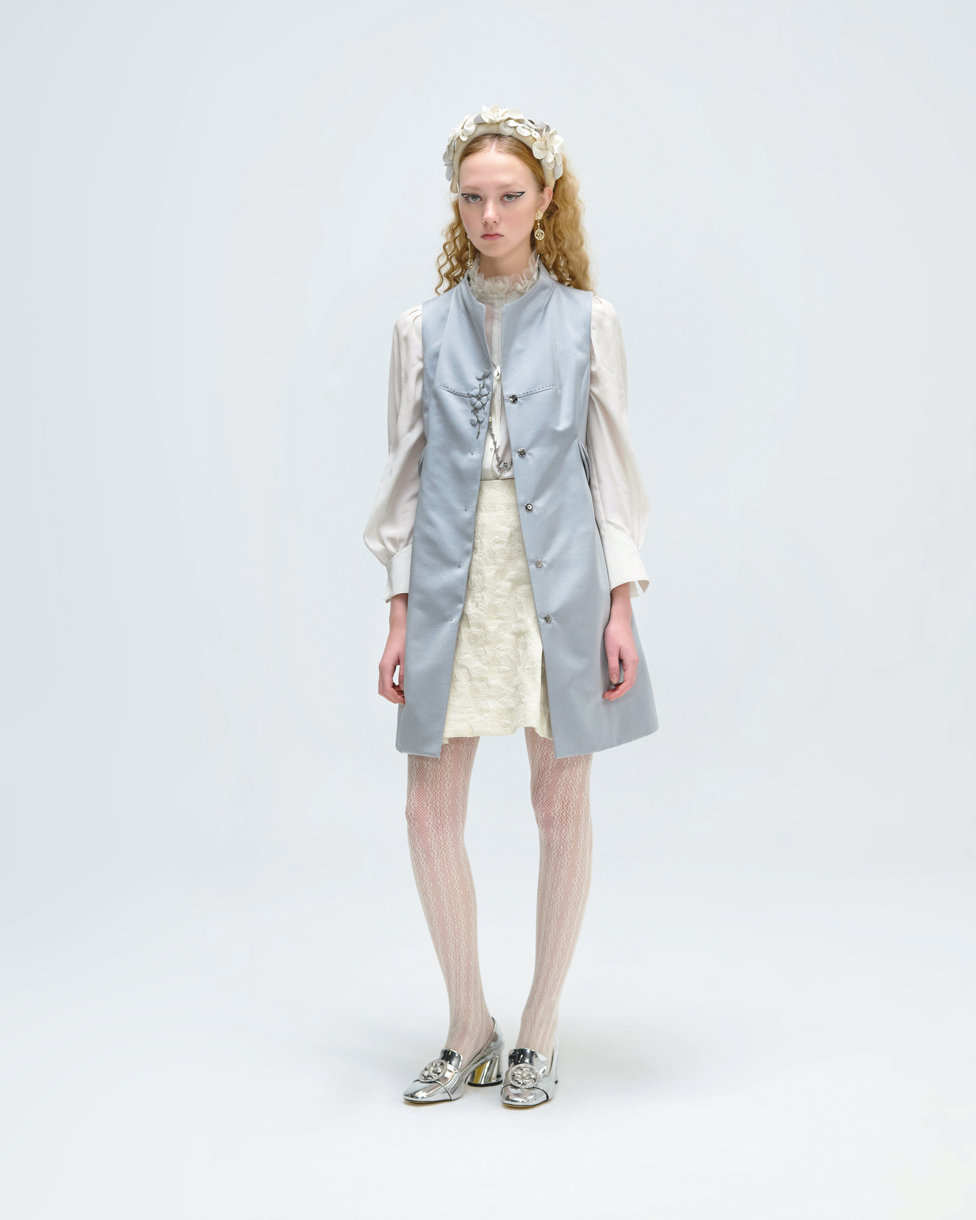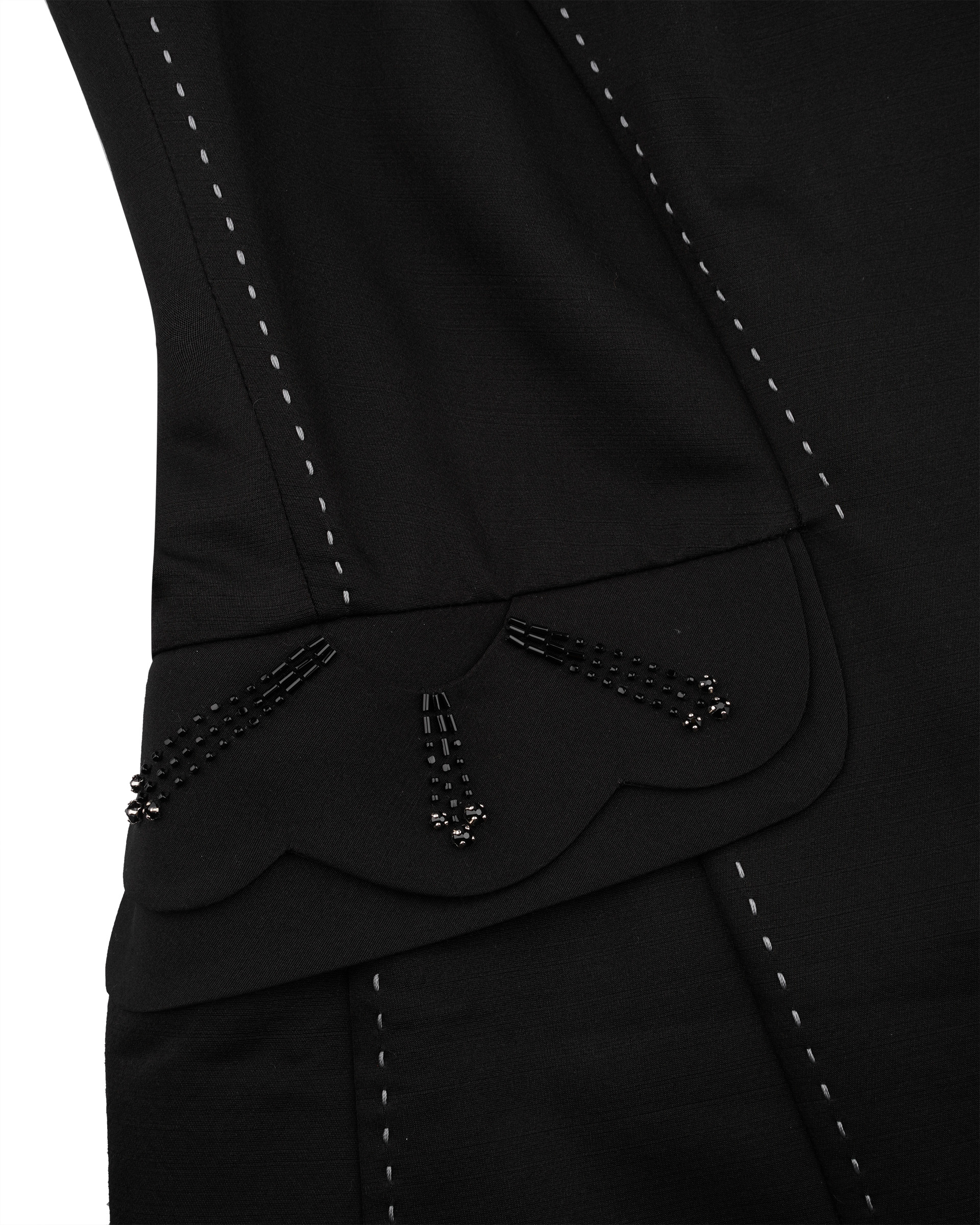 This vest is shaped in minimal silhouette within delicate details. The beading and appliqued plum blossom patterns are detailed on the pocket covers and front placket. The hand stitched curves are decorated on the opposite face of collar, it is the turely hidden luxury. This piece is tailored from shined wool-silk blend that could highlight your autumn looks with low profile glitter.