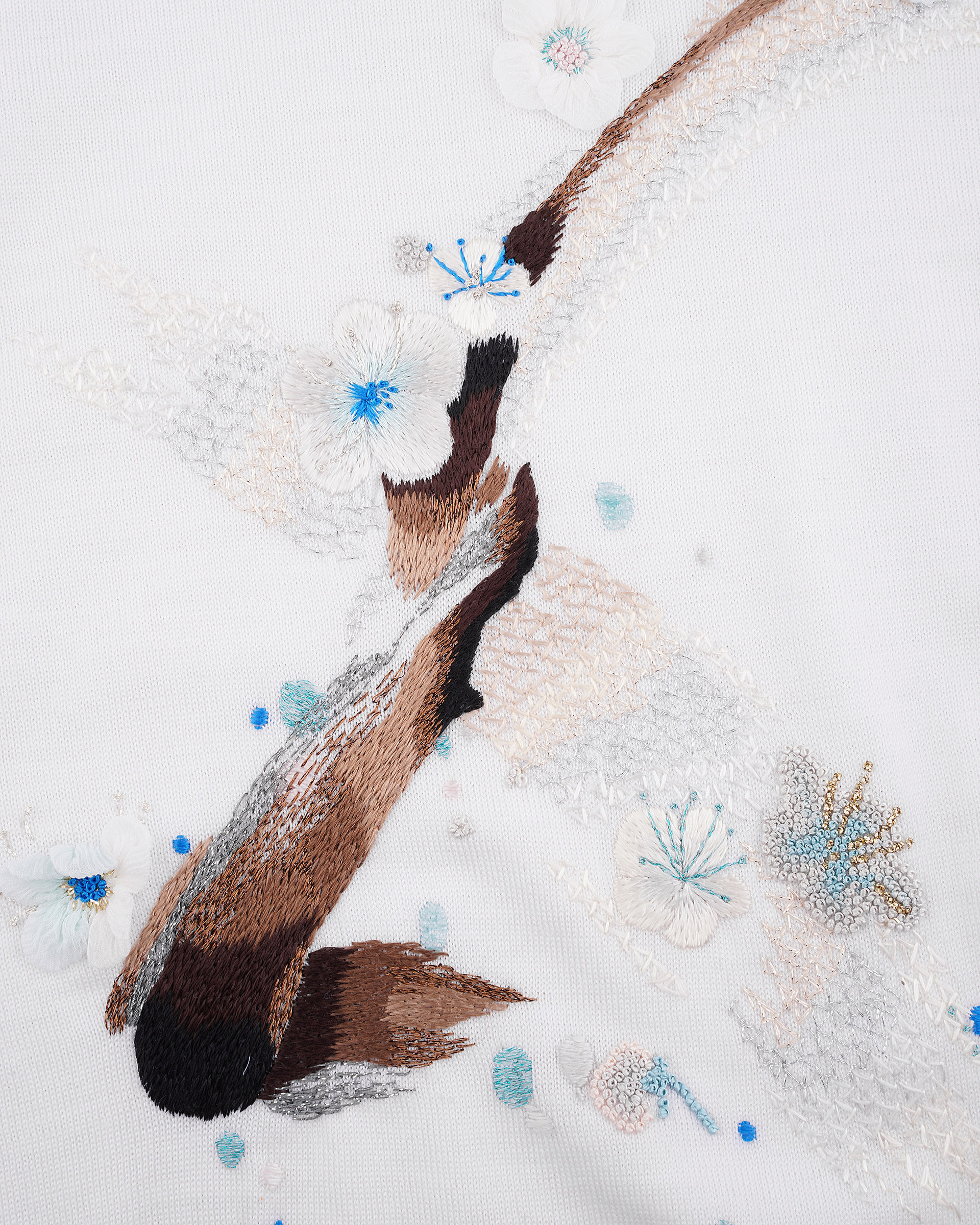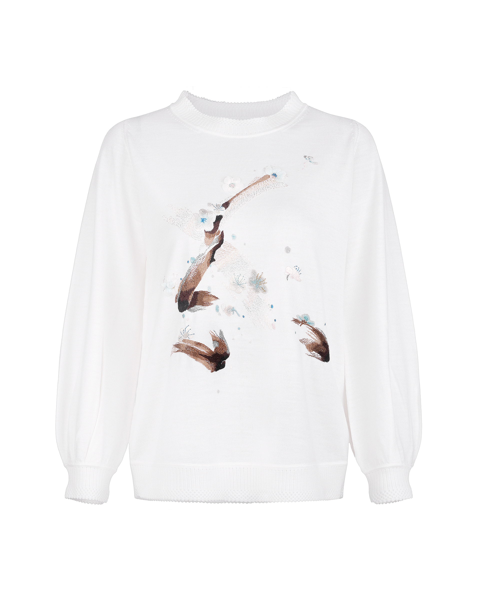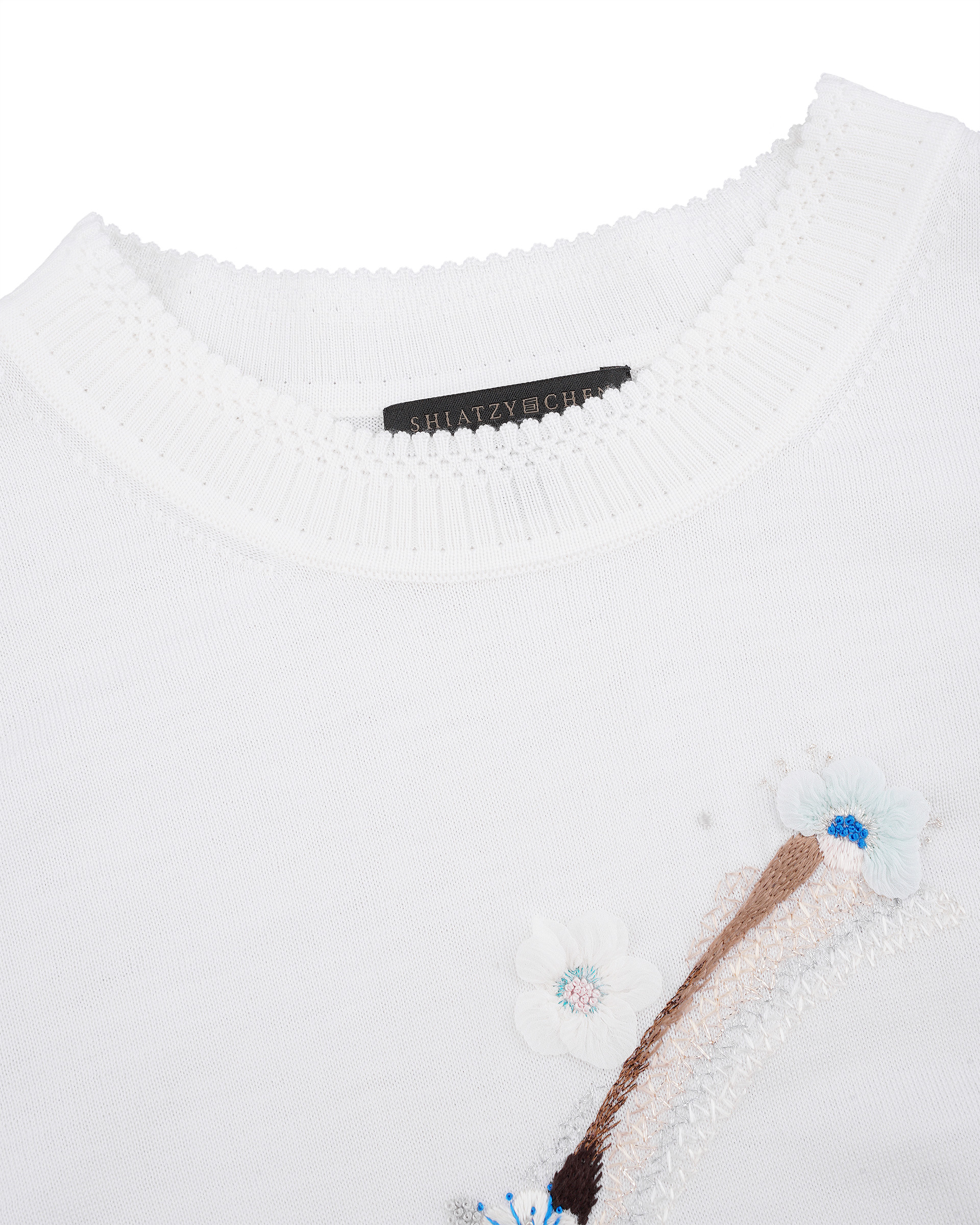 This knit top is edited in relaxed silhouette. Embellished with hand made embroidery which is inspired from plum blossom that makes this casual number a delicate upgrade. This piece could help you have an off-duty look with neo-Chinese style.