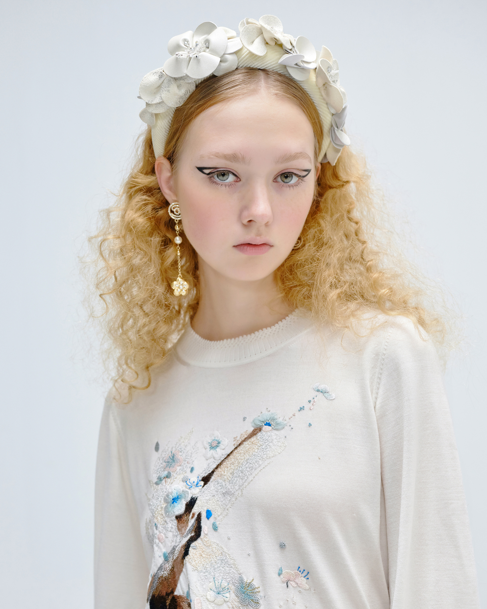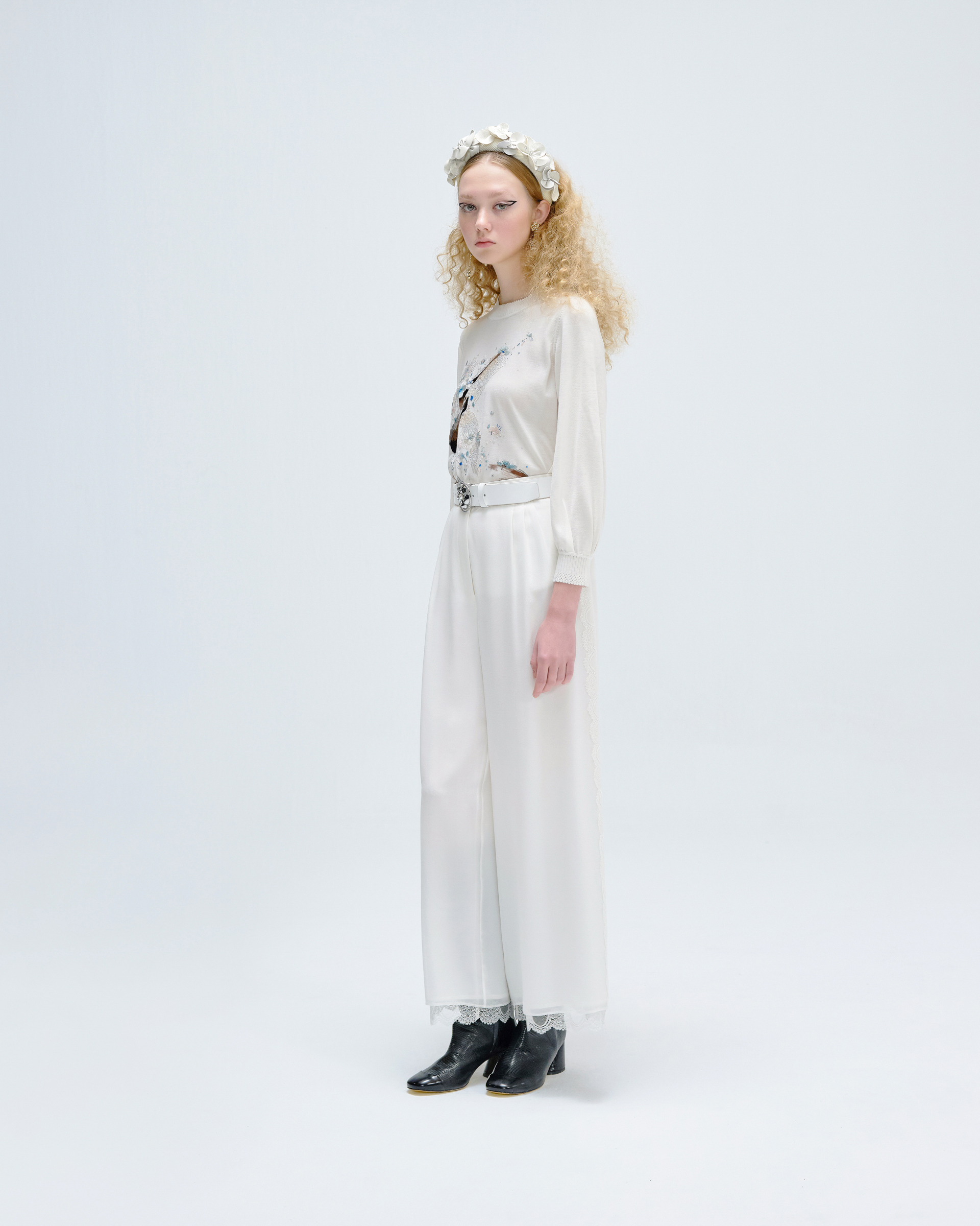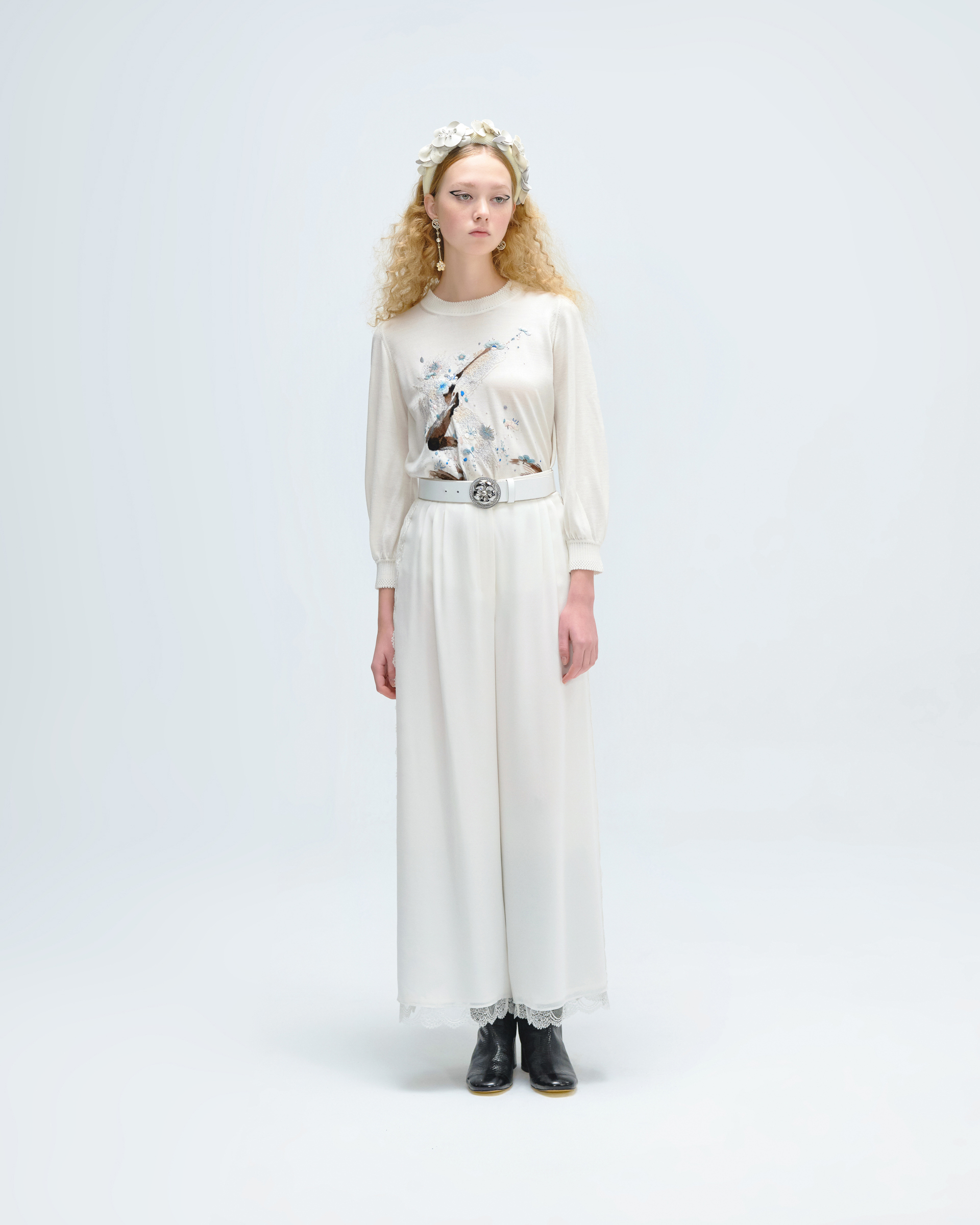 This knit top is edited in relaxed silhouette. Embellished with hand made embroidery which is inspired from plum blossom that makes this casual number a delicate upgrade. This piece could help you have an off-duty look with neo-Chinese style.