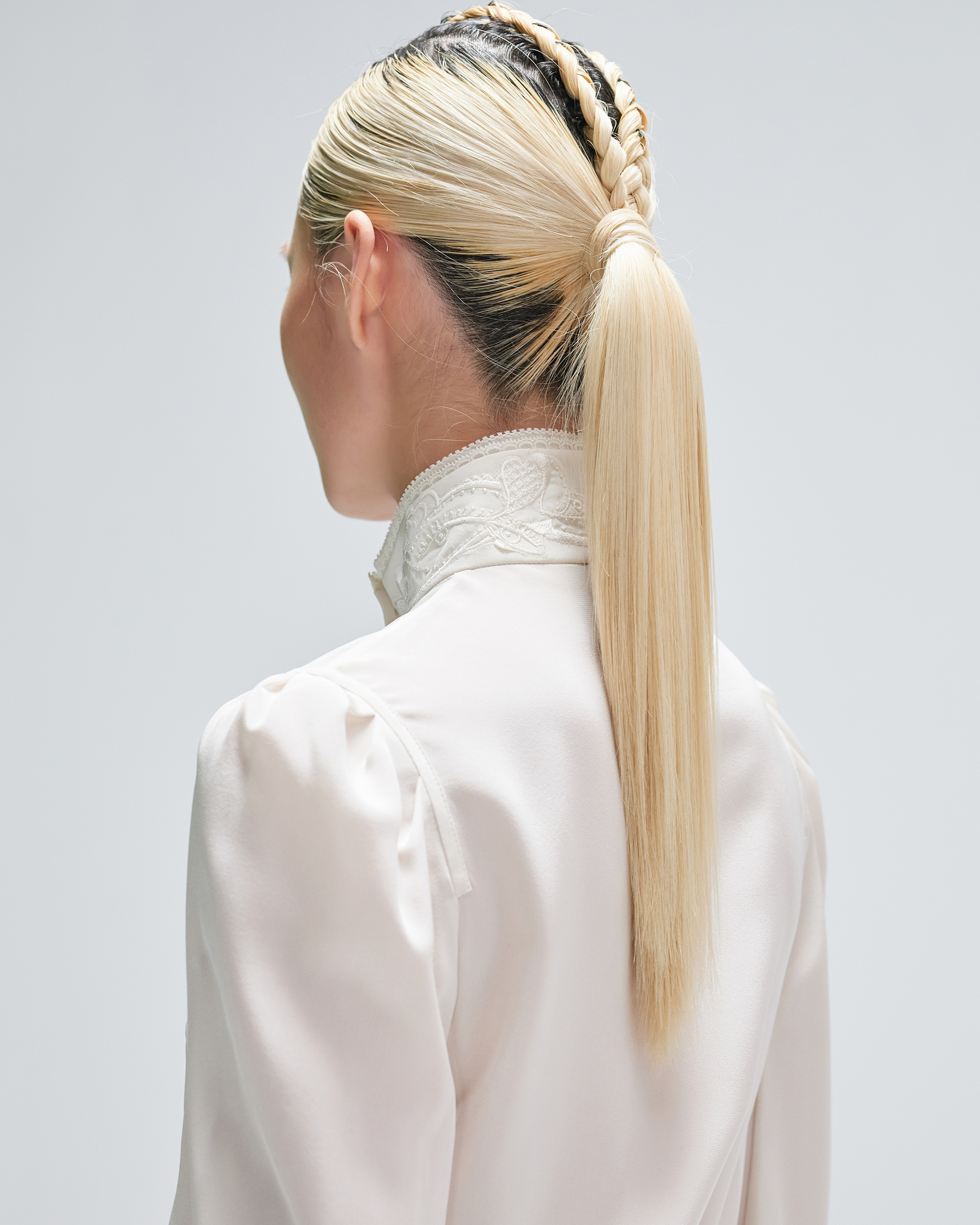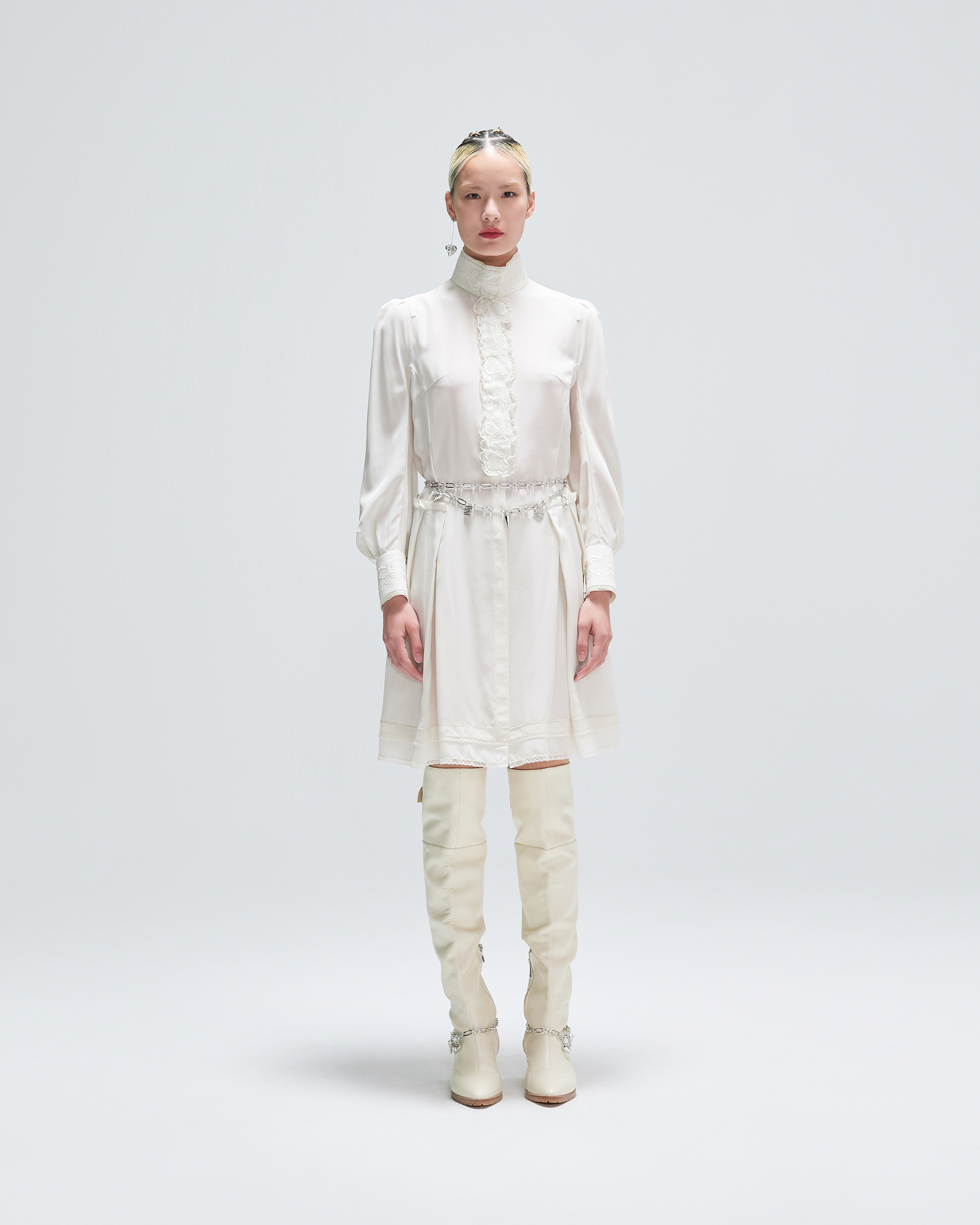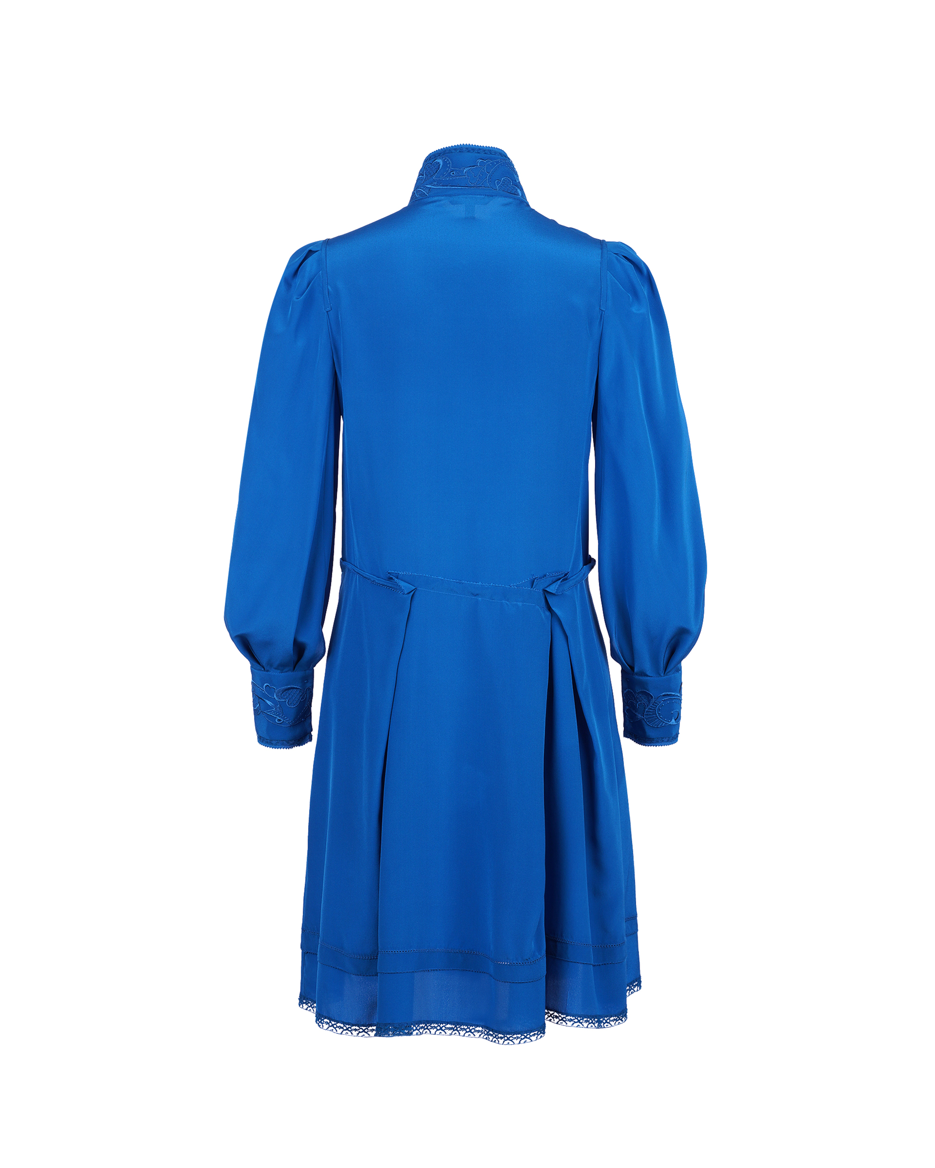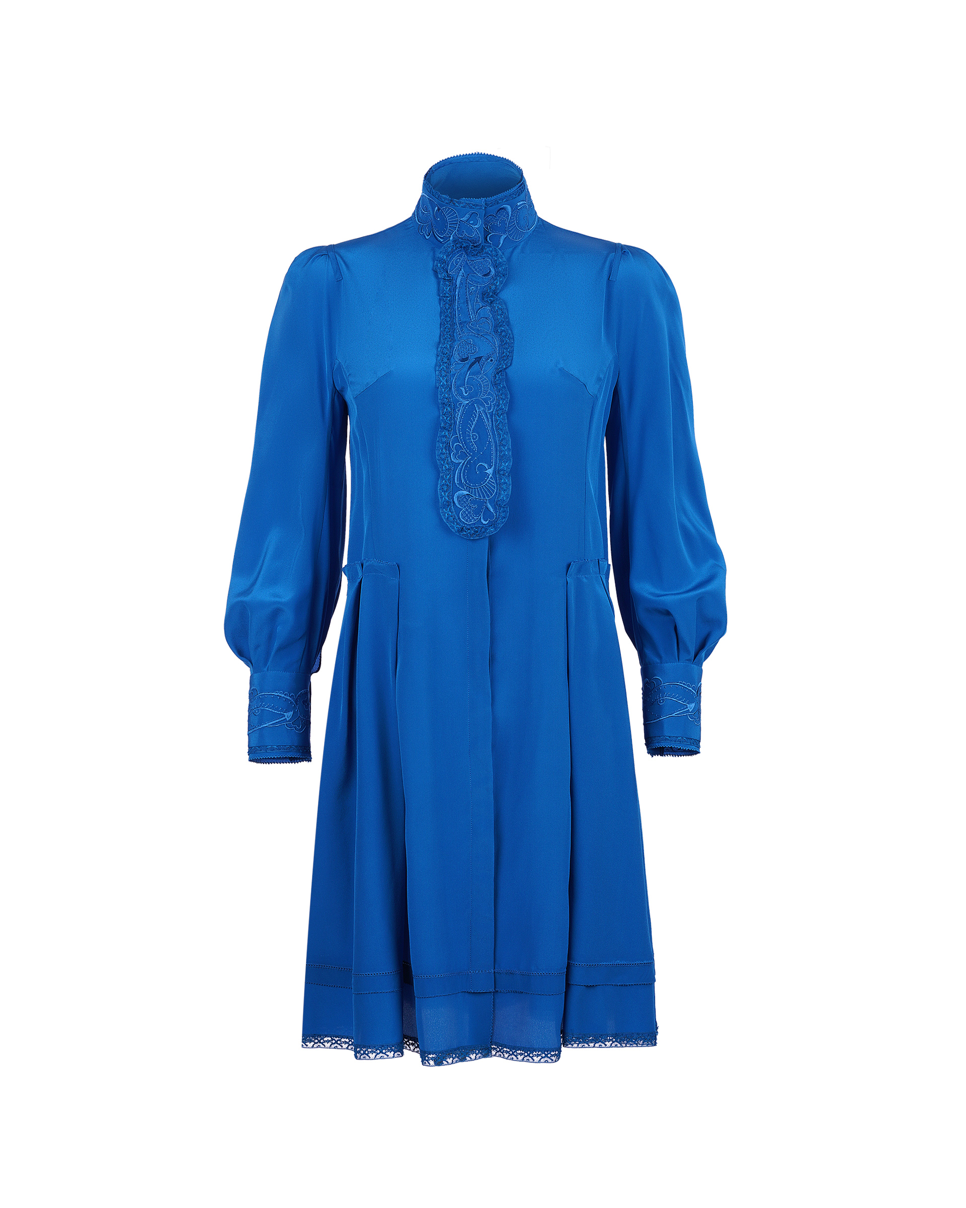 This dress is tailored from floating silk fabric. The collar is embroidered with delicate pattern and an embroidery panel is detailed on the front placket. This dress is comfortable and light that could help you having a carefree breezy look.