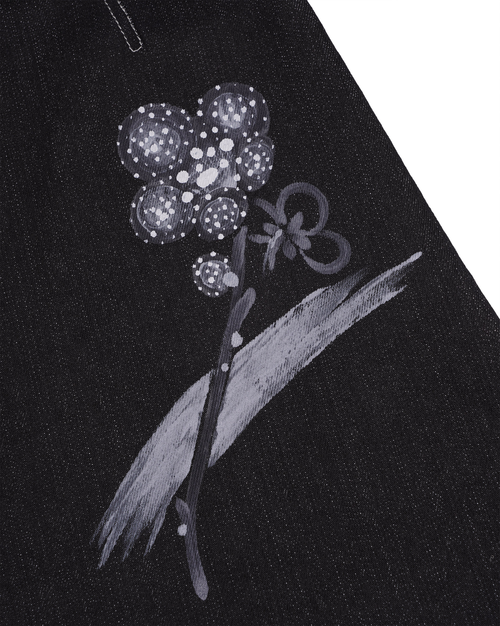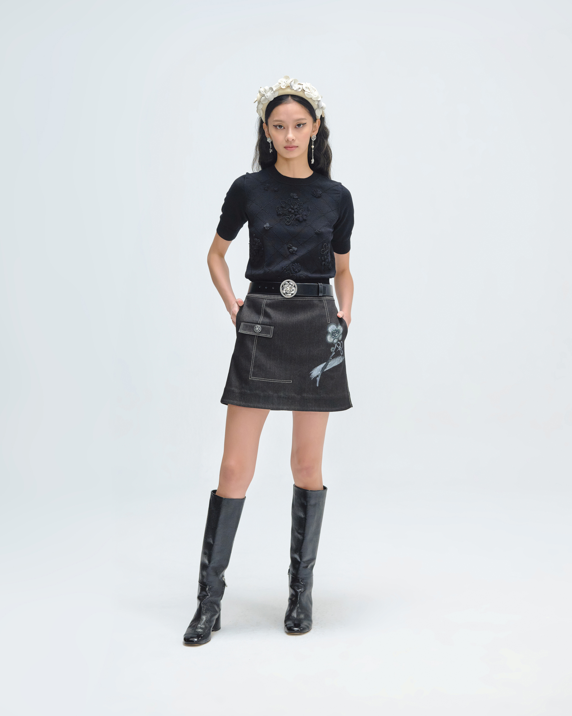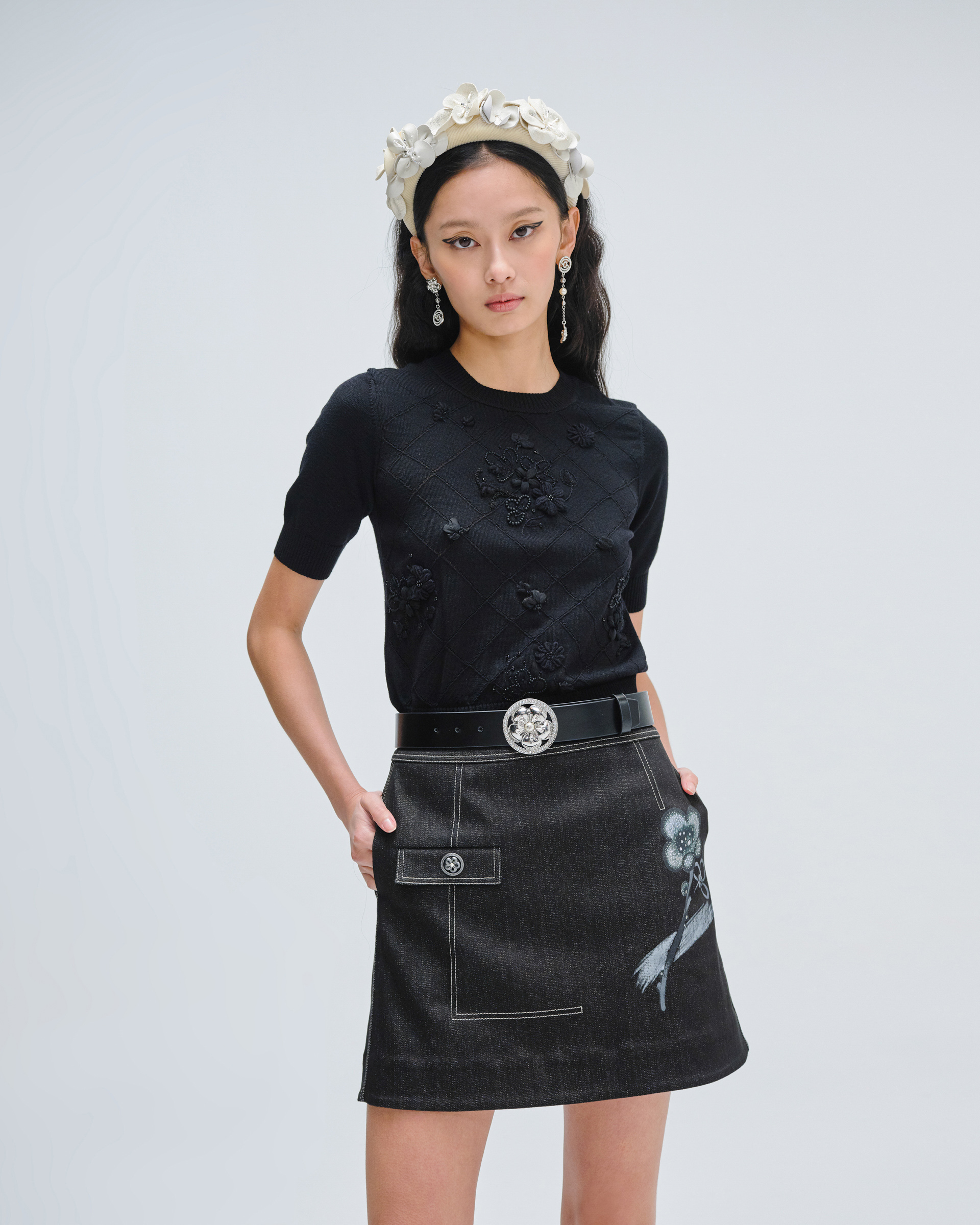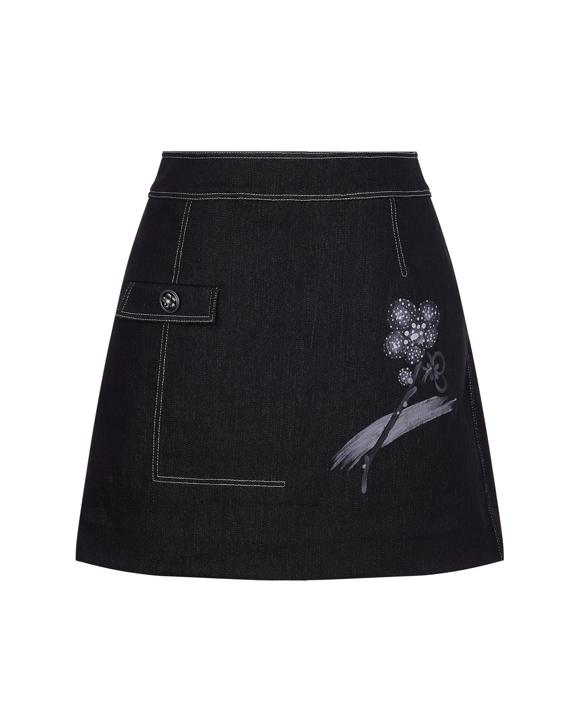 This mini skirt is tailored from stretch denim. Detailed with hand drawn plum blossom totem representing the elegant artistic style.
