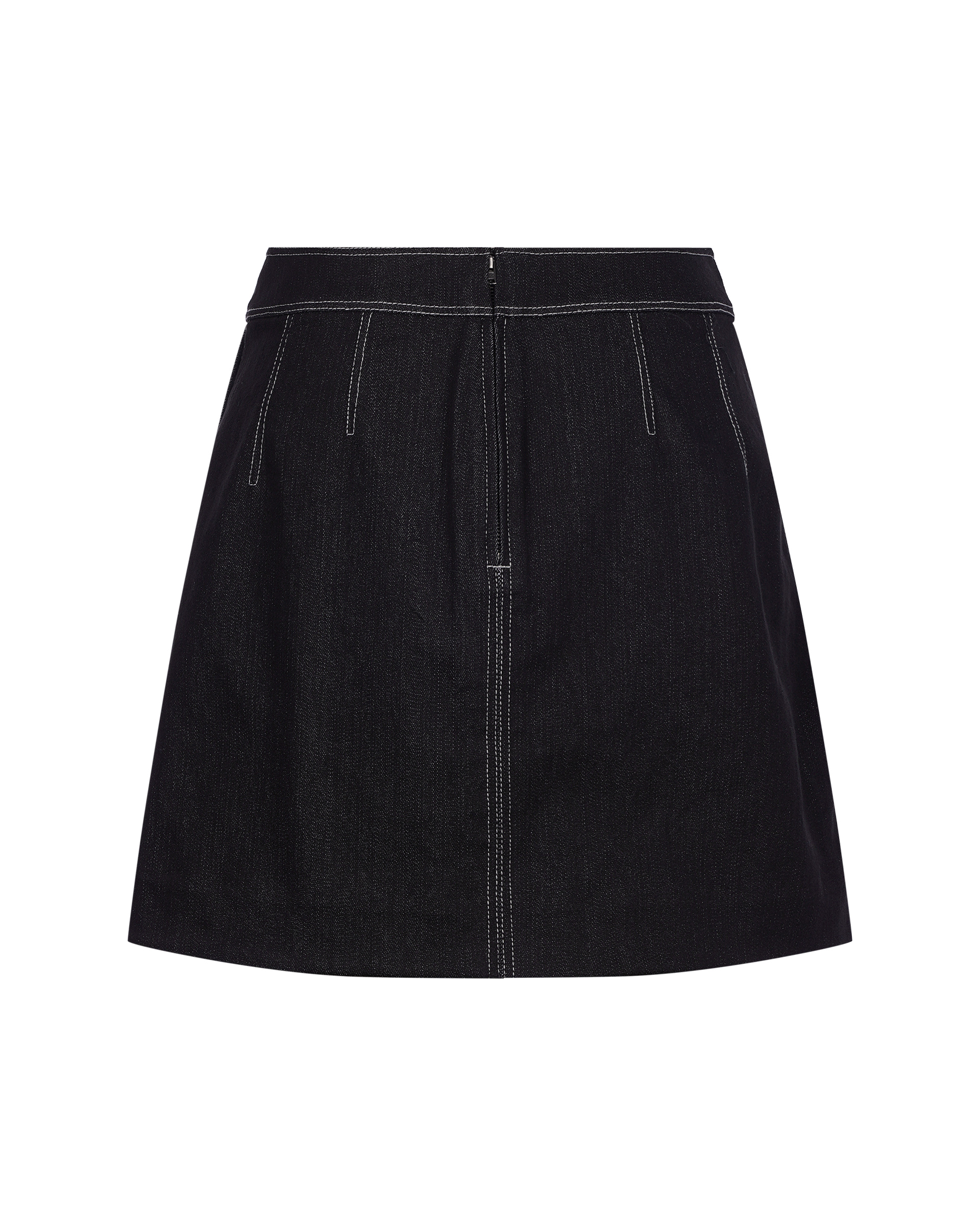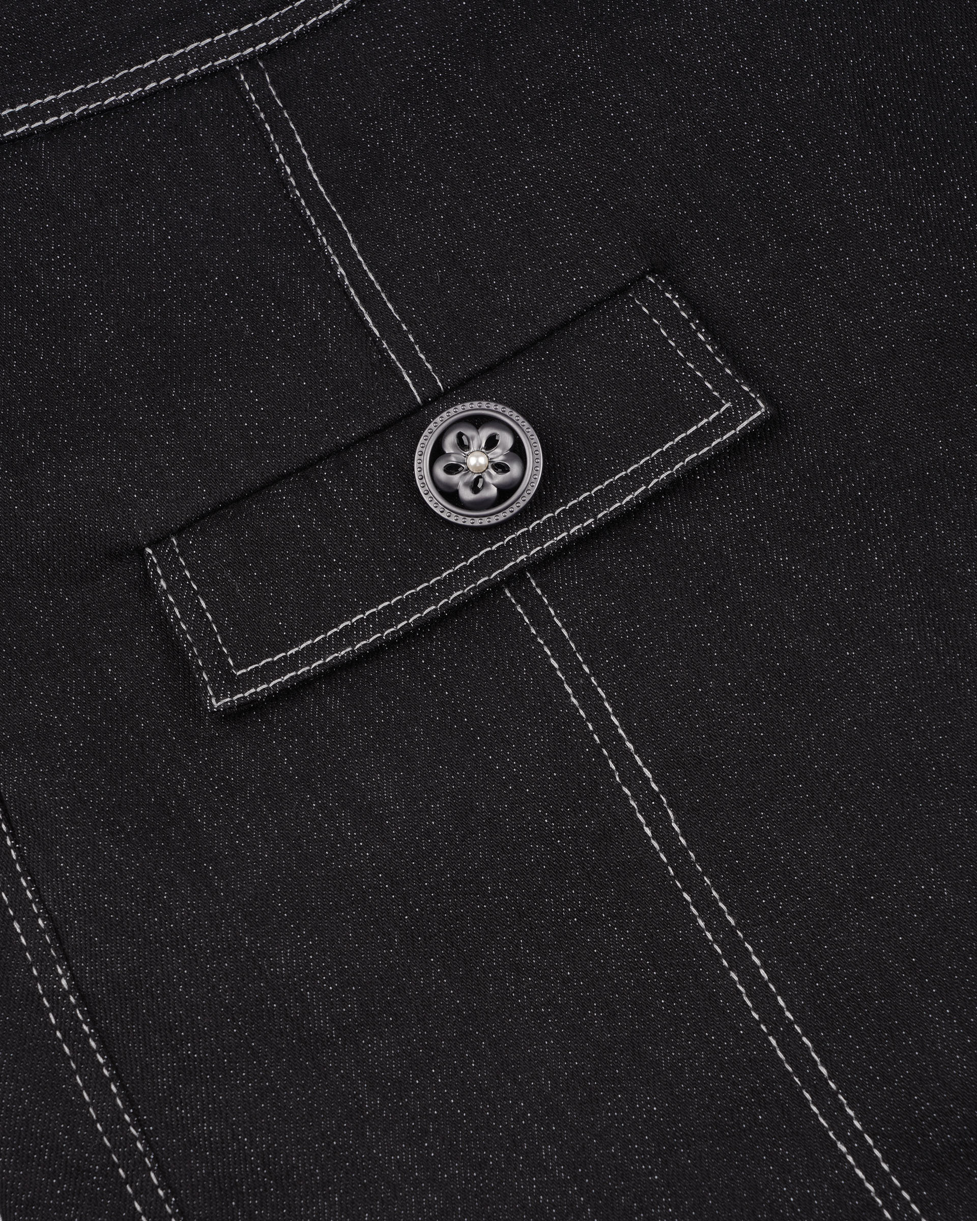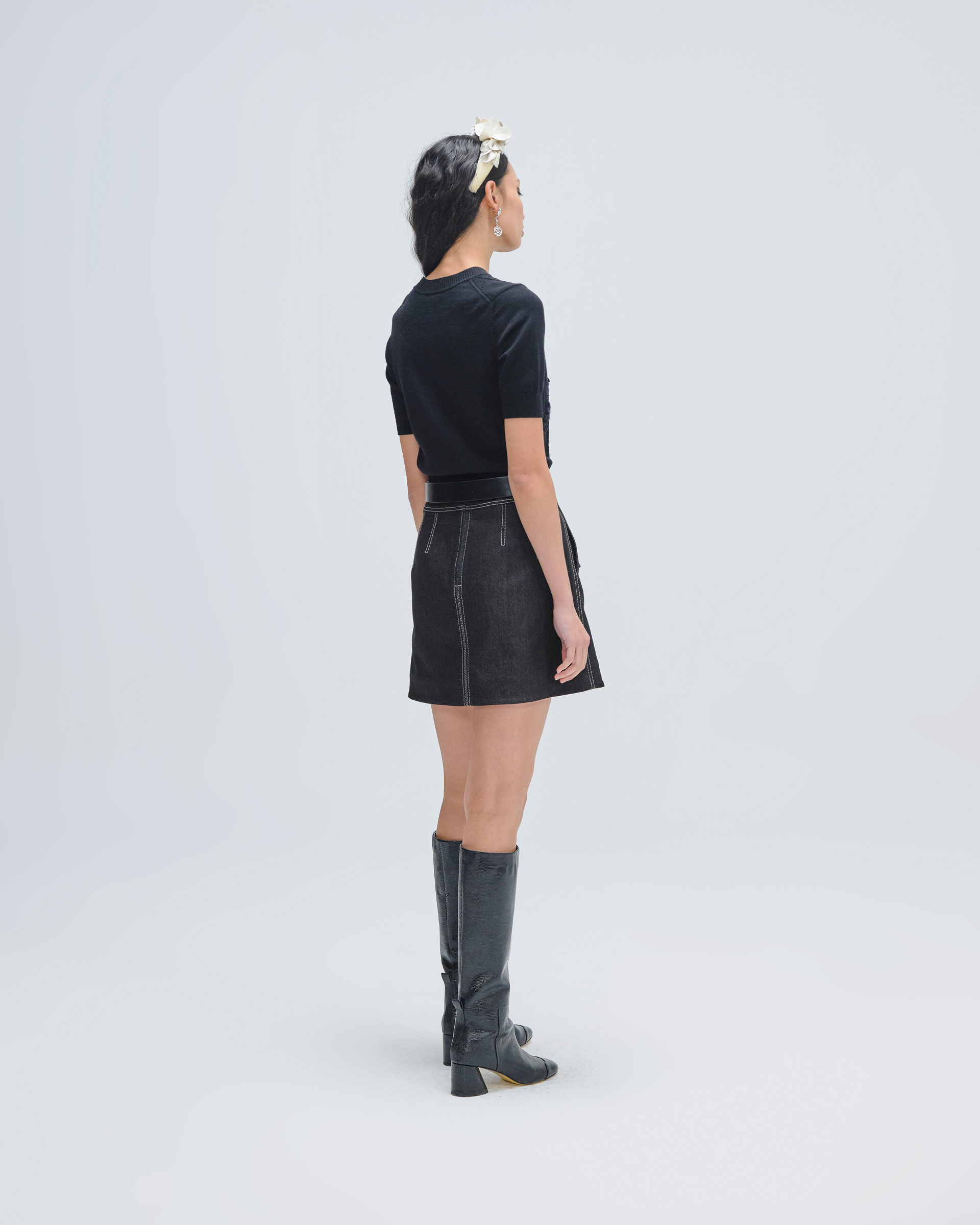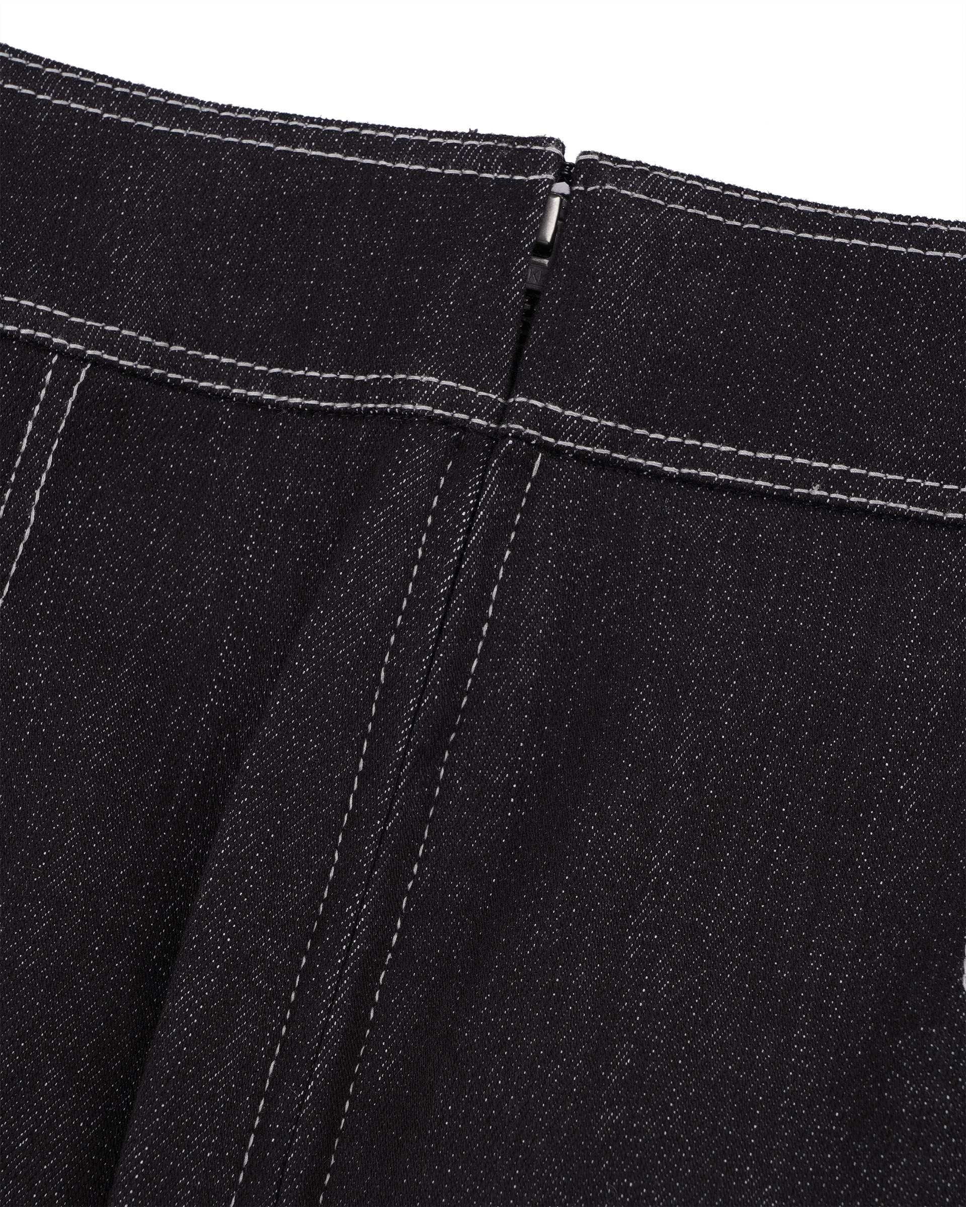 This mini skirt is tailored from stretch denim. Detailed with hand drawn plum blossom totem representing the elegant artistic style.