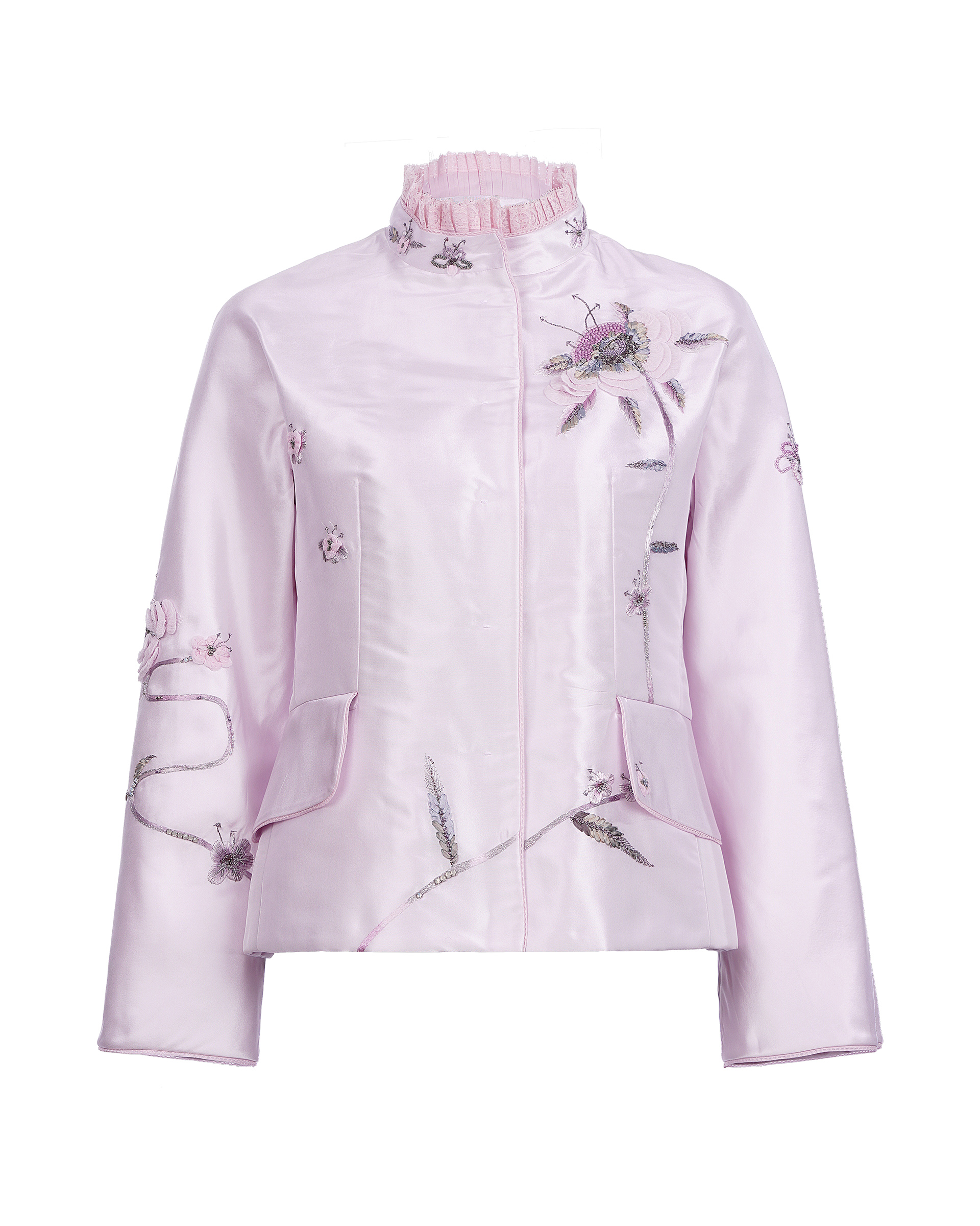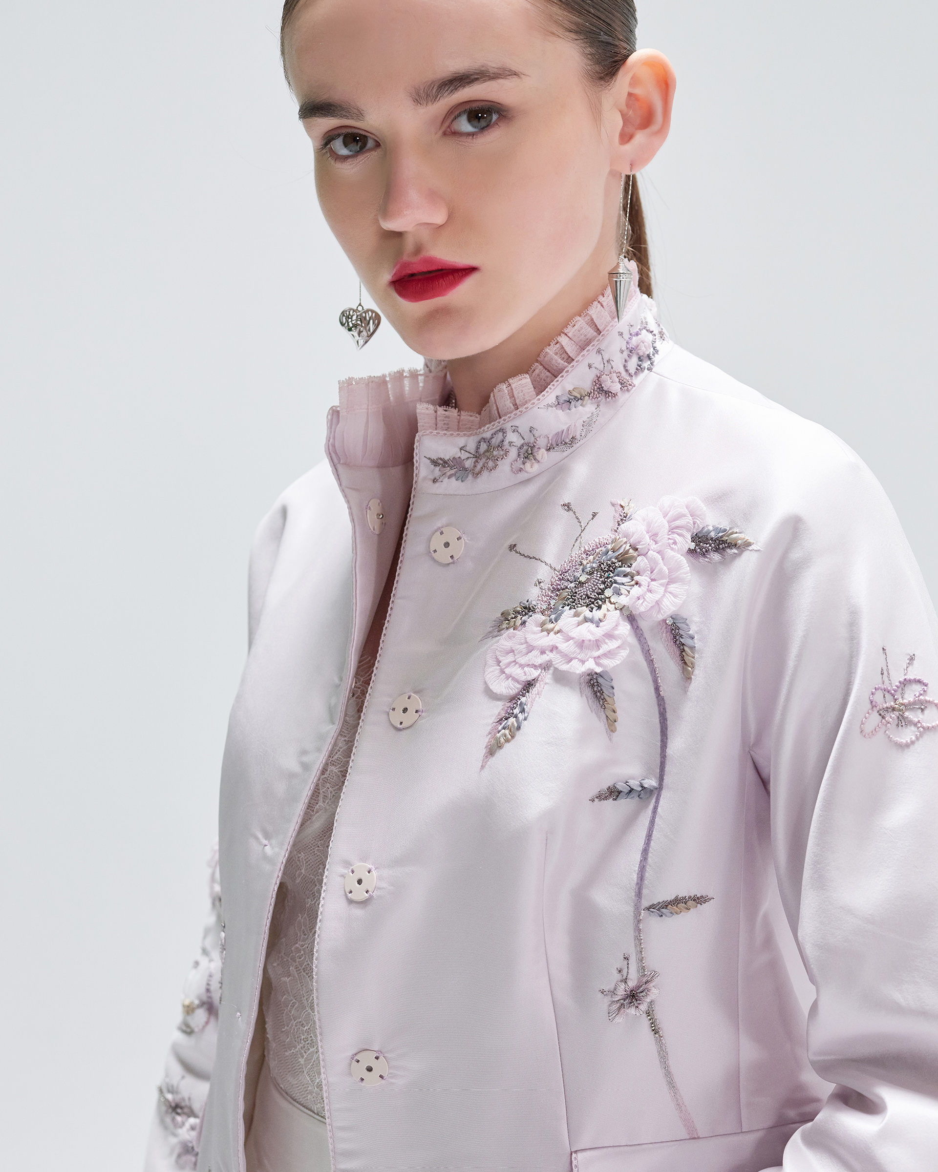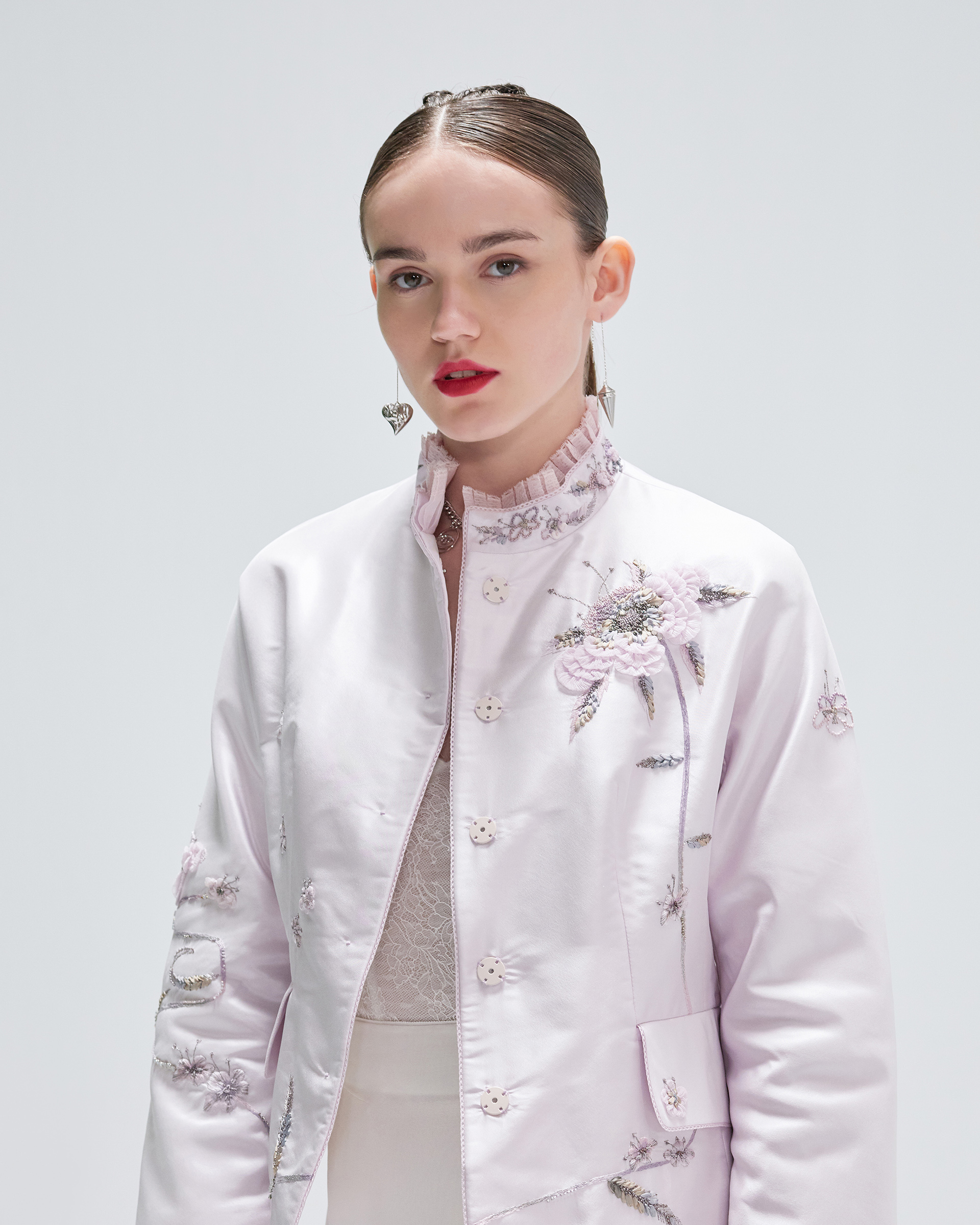 This jscket is tailored fron taffeta and the Mandarin collar is decorated with pleated lace.Embellishing with hand made embroidery pattern to highlight the precious craftmanship. This piece is cutted in slim silhouette and quited lightly. It could offer you a warm and elegant winter outfit.