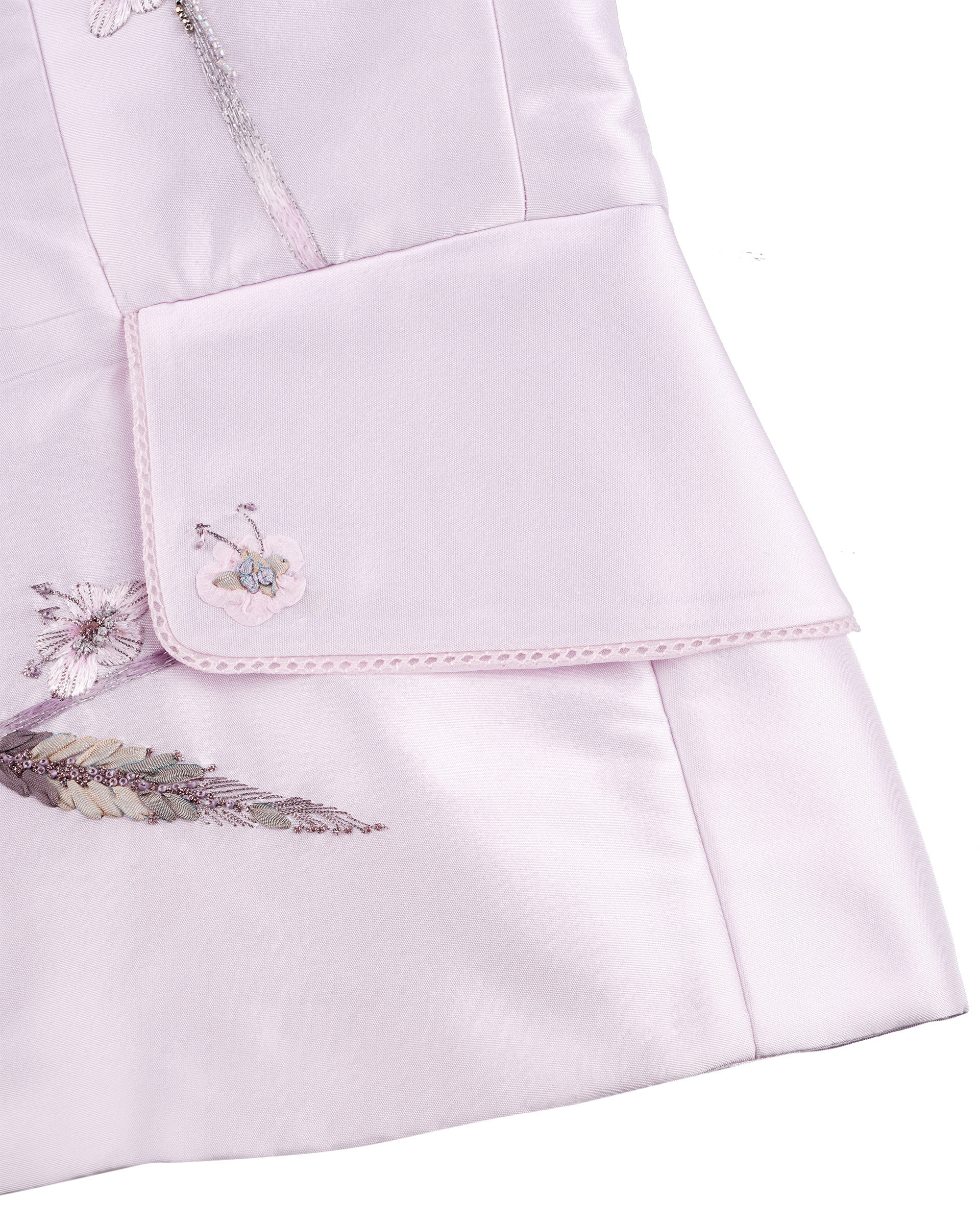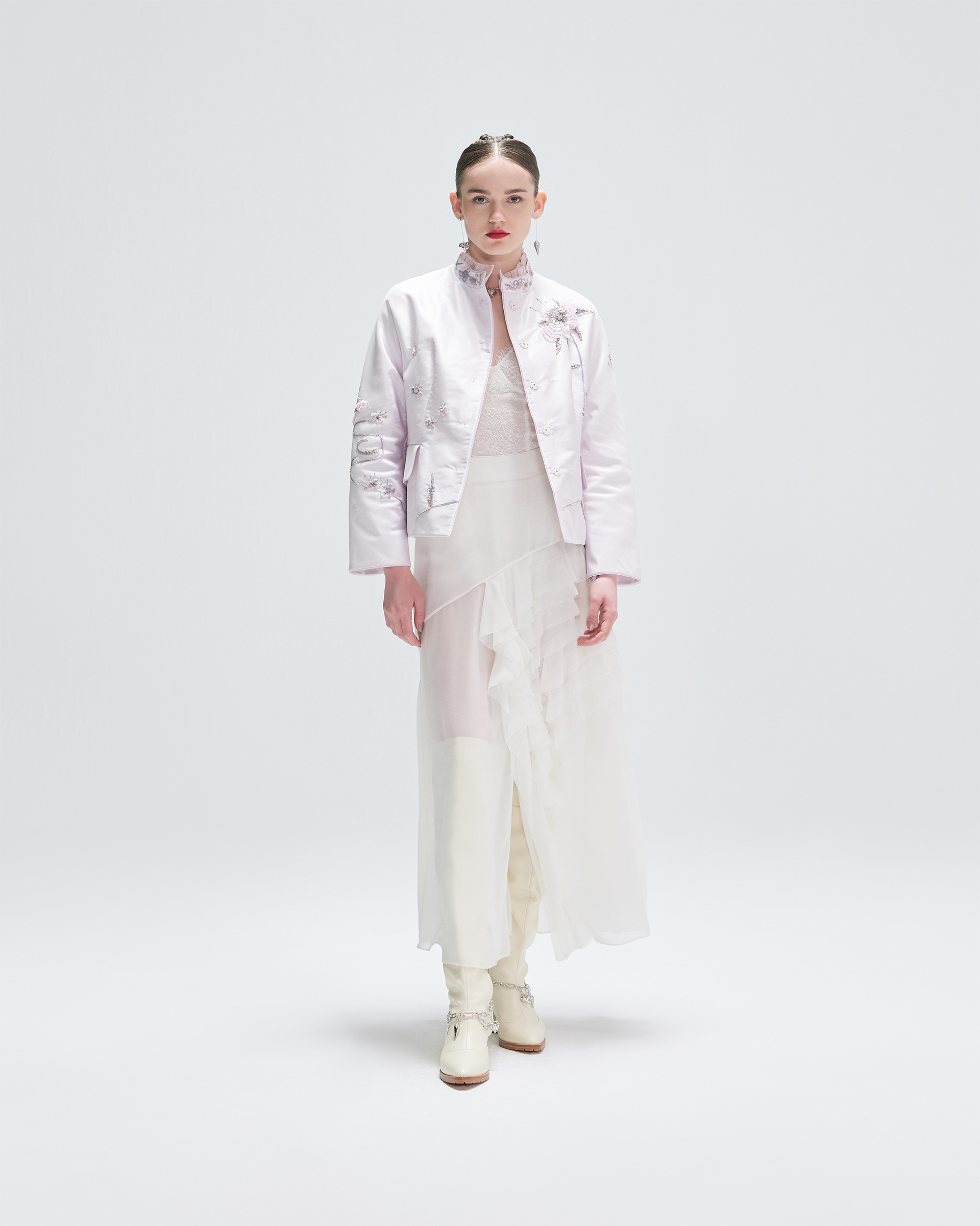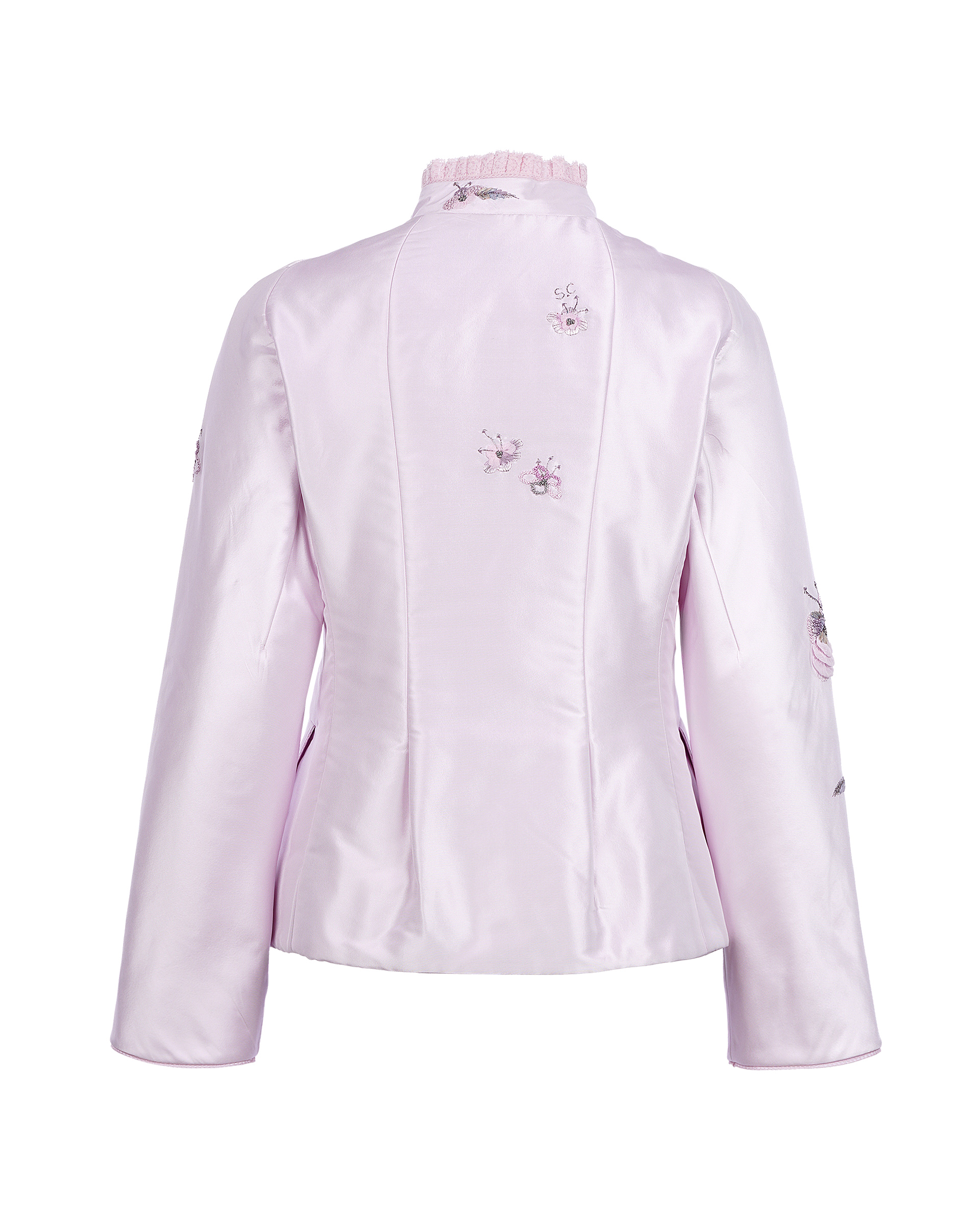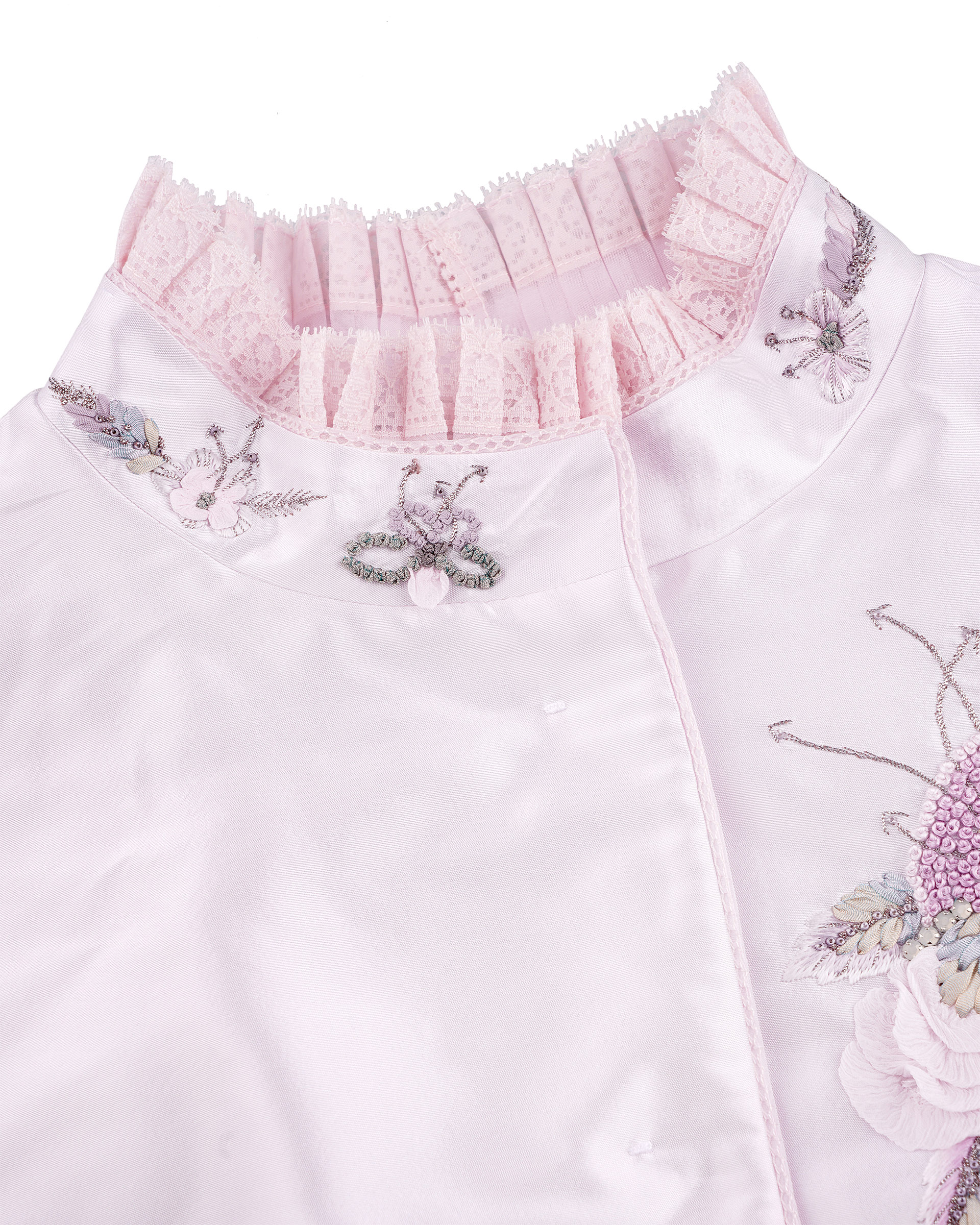 This jscket is tailored fron taffeta and the Mandarin collar is decorated with pleated lace.Embellishing with hand made embroidery pattern to highlight the precious craftmanship. This piece is cutted in slim silhouette and quited lightly. It could offer you a warm and elegant winter outfit.