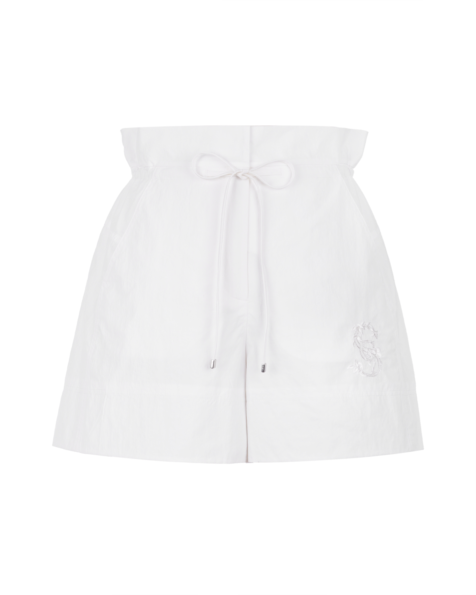 This shorts is cutted on straight silhouette.Punctuated with a high waist designed in a paperbag silhouette and SC embroidery, this pair boasts a ruched waistline that adds grace to your looks.